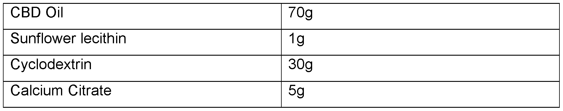 25 to 75 % CBD oil; and 4 to 16 % maltodextrin.