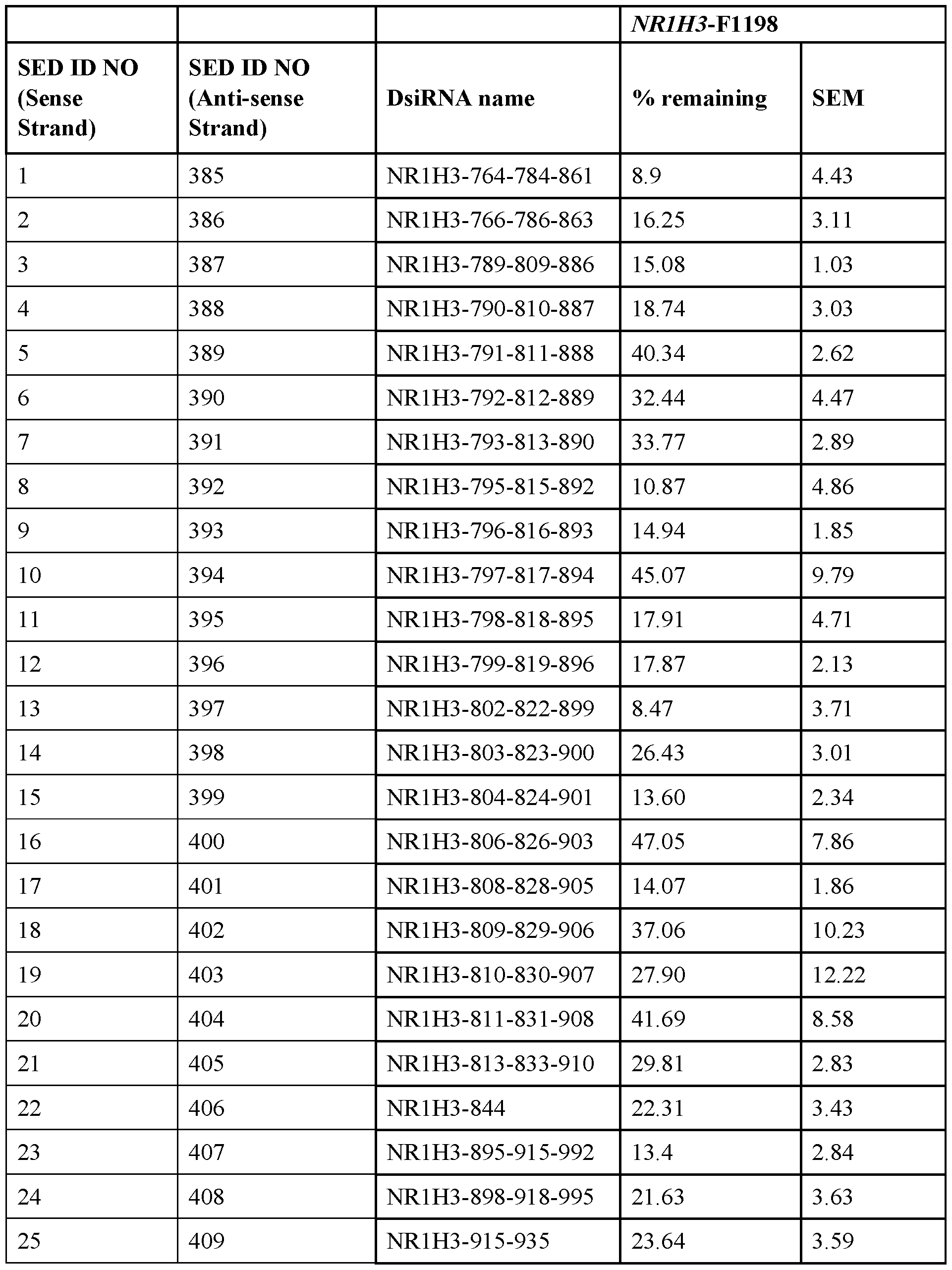 Embodiment 74. A method for treating a subject having a disease, disorder or condition associated with NR1H3 expression, the method comprising administering to the subject a therapeutically effective amount of an RNAi oligonucleotide comprising a sense strand and an antisense strand, wherein the sense strand and the antisense strand form a duplex region, wherein the antisense strand comprises a region of complementarity to a NR1H3 mRNA target sequence of any one of SEQ ID NOs: 1-384, and wherein the region of complementarity is at least 15 contiguous nucleotides in length.