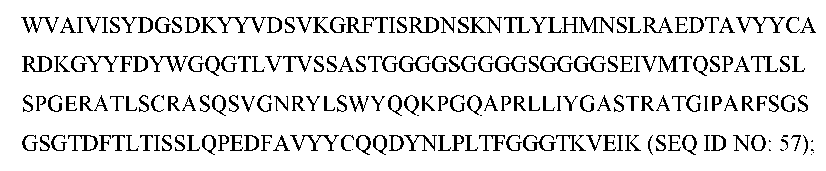- an HCDR1 comprising an amino acid sequence of GFTFSKYG (SEQ ID NO: 50), an HCDR2 comprising an amino acid sequence of IWYDGSIK (SEQ ID NO: 51), and HCDR3 comprising an amino acid sequence of ARGSLWFGEFYFDY (SEQ ID NO: 52); and an LCDR1 comprising an amino acid sequence of QGISSA (SEQ ID NO: 53), an LCDR2 comprising an amino acid sequence of DAS (SEQ ID NO: 54), an LCDR3 comprising an amino acid sequence of QQFNNYPRT (SEQ ID NO: 55).