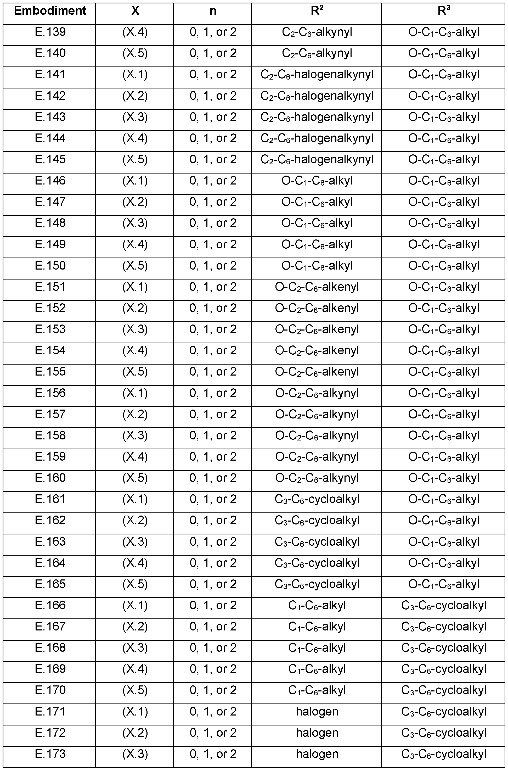- R 3 is in each case independently selected from CrC 6 -alkyl, CrC 6 -halogenalkyl, C2-C6- alkenyl, C2-C6-halogenalkenyl, C2-C6-alkynyl, C2-C6-halogenalkynyl, 0-CrC 6 -alkyl, O-C2- C 6 -alkenyl, 0-C 2 -C 6 -alkynyl, C3-C6-cycloalkyl;