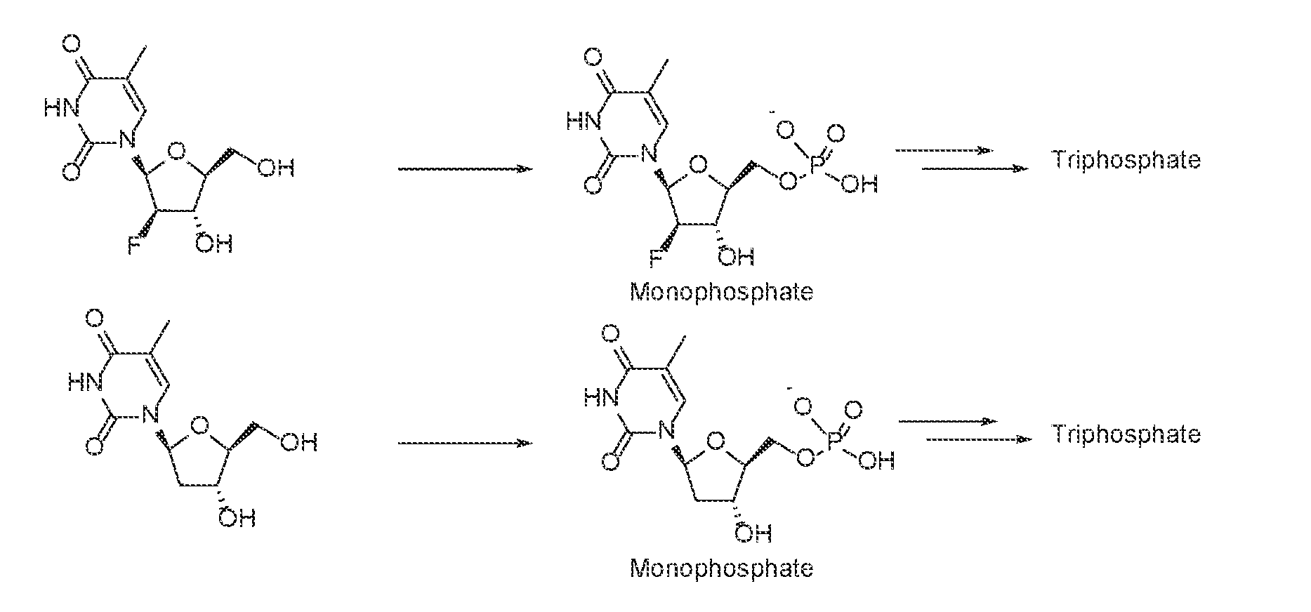- DETAILED DESCRIPTION [0032] Nucleoside monophosphates and monophosphonates are attractive drug targets as conversion to the active triphosphate is rapid and the initial rate limiting phosphorylation is not required. However, nucleoside monophosphates are limited as drug candidates as they are not efficiently transported to therapeutic target in cells.