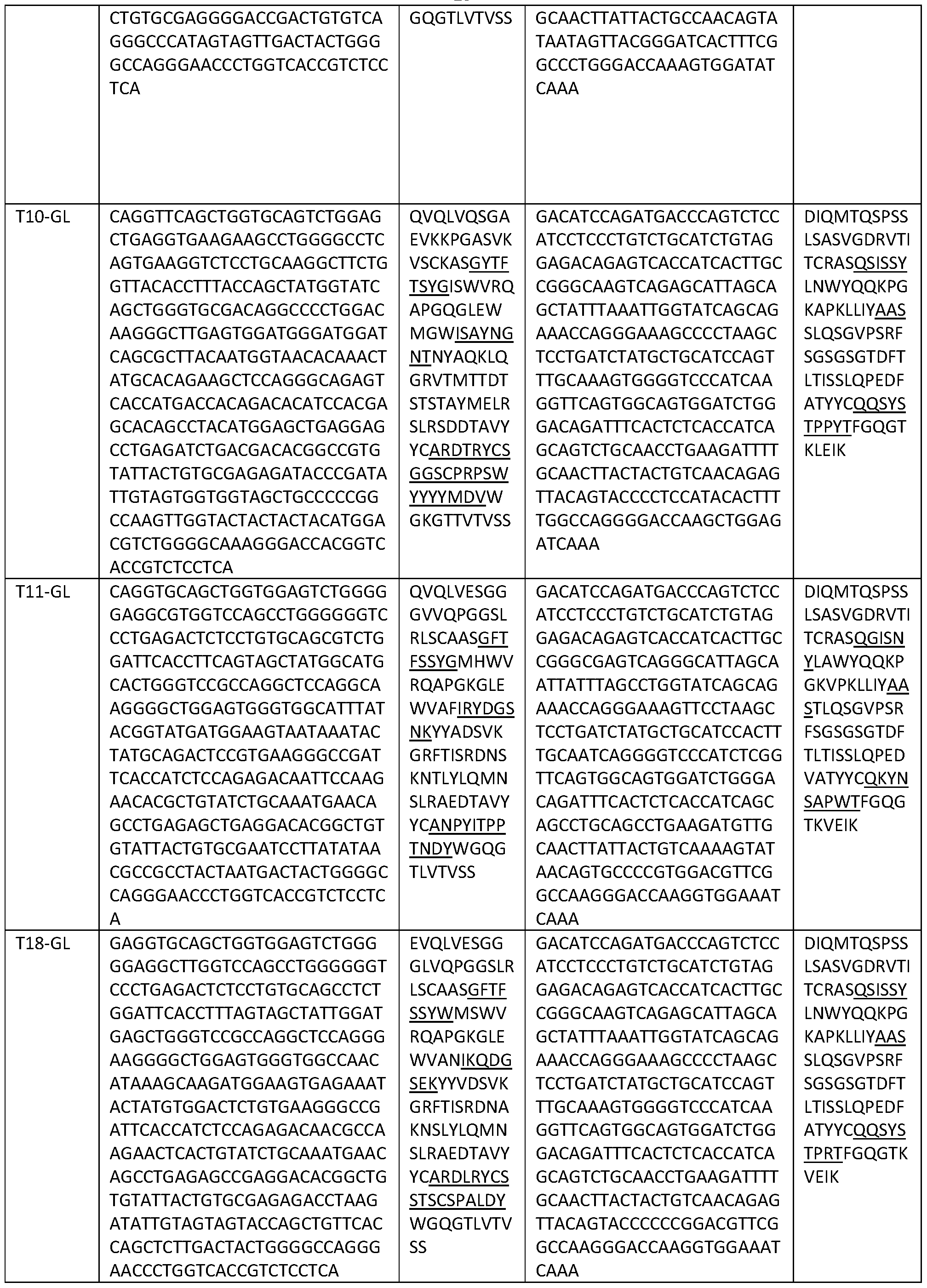 - a monoclonal antibody comprising an antigen binding domain which comprises the complementarity determining regions (CDRs) CDRH1, CDRH2, CDRH3, CDRL1, CDRL2 and CDRL3 or the heavy chain and light chain of an antibody selected from the group consisting of Tl, T2, T3, T4, T5, T6, T7, T8, T10, Ti l, T12, T13, T14, T15, T17, T18, T19, T20, T21, T22, T23, T24, T25, T26, T27, T28, T29, T30, T4-GL, T7-GL, T22-GL, T30-GL, T12 MRCA, T13 MRCA and T3-16-17 MRCA1 and T3-16-17 MRCA2.
