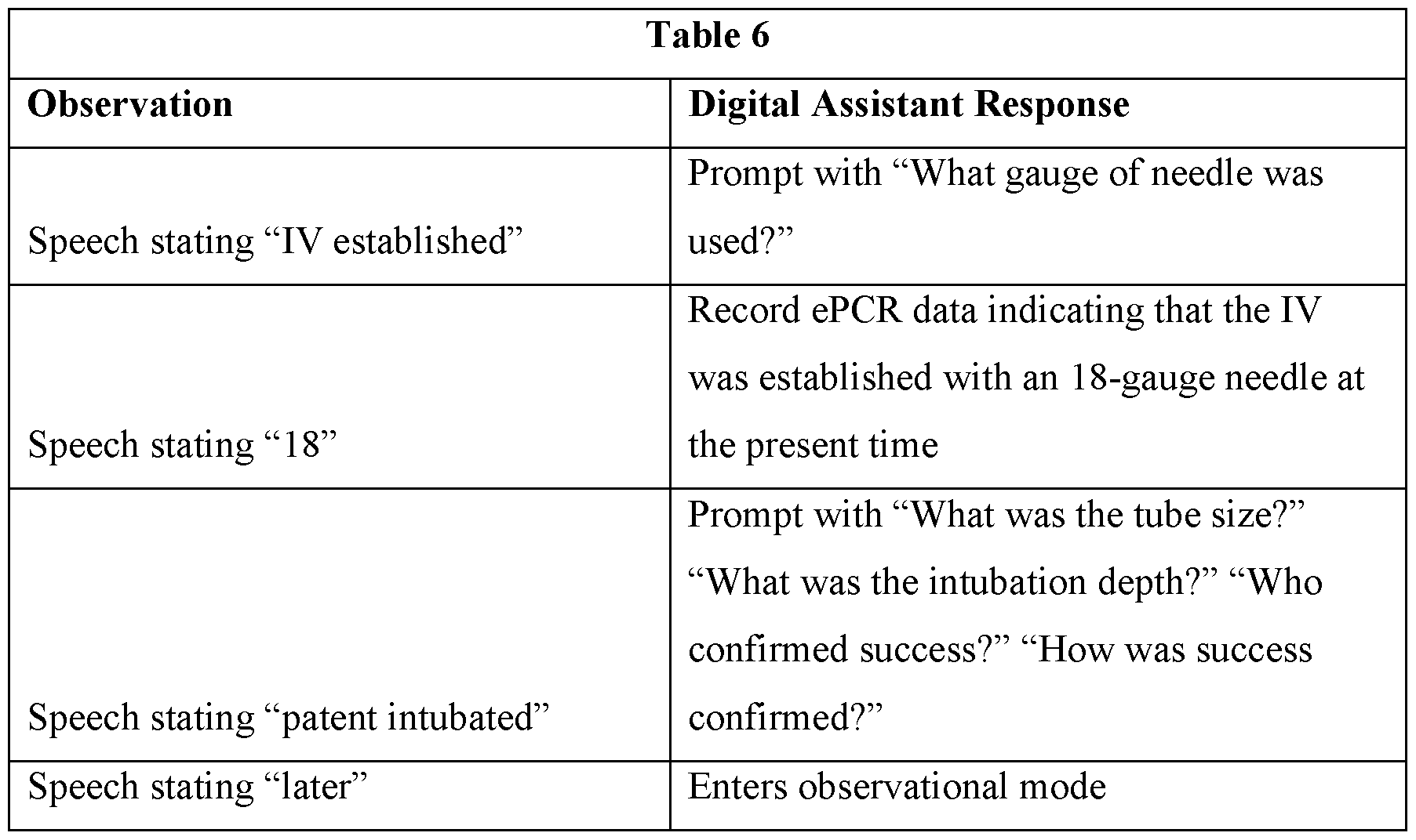 [0029] In the system, the plurality of interactivity modes may include an observational mode in which the digital assistant is configured not to prompt the caregiver to confirm operations identified by the digital assistant prior to execution of the operations. The operations identified by the digital assistant include storage of values in ePCR data fields based on one