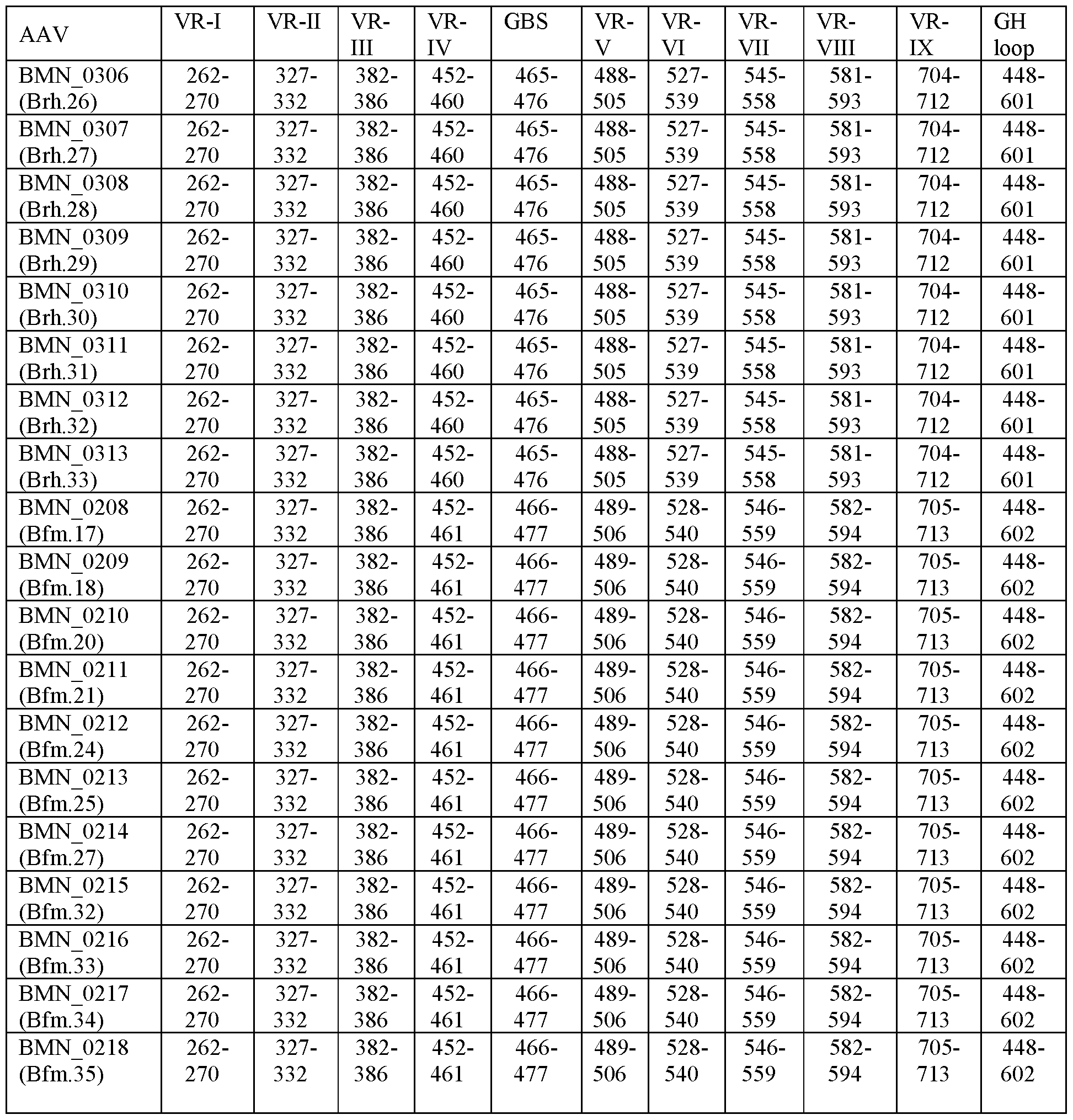 - Table 2.20, 2.21, or 2.22) that comprises a VP1 amino acid sequence that is at least 90%, at least 95%, at least 98%, or at least 99% identical to a VP1 amino acid sequence of a capsid protein with a “BCD ” prefix in the same table comprises a variable region sequence (e.g., GBS region or GH loop) that is identical to the GBS region or GH loop found in the VP1 amino acid sequence of the capsid protein with the “BCD ” prefix in the same table.