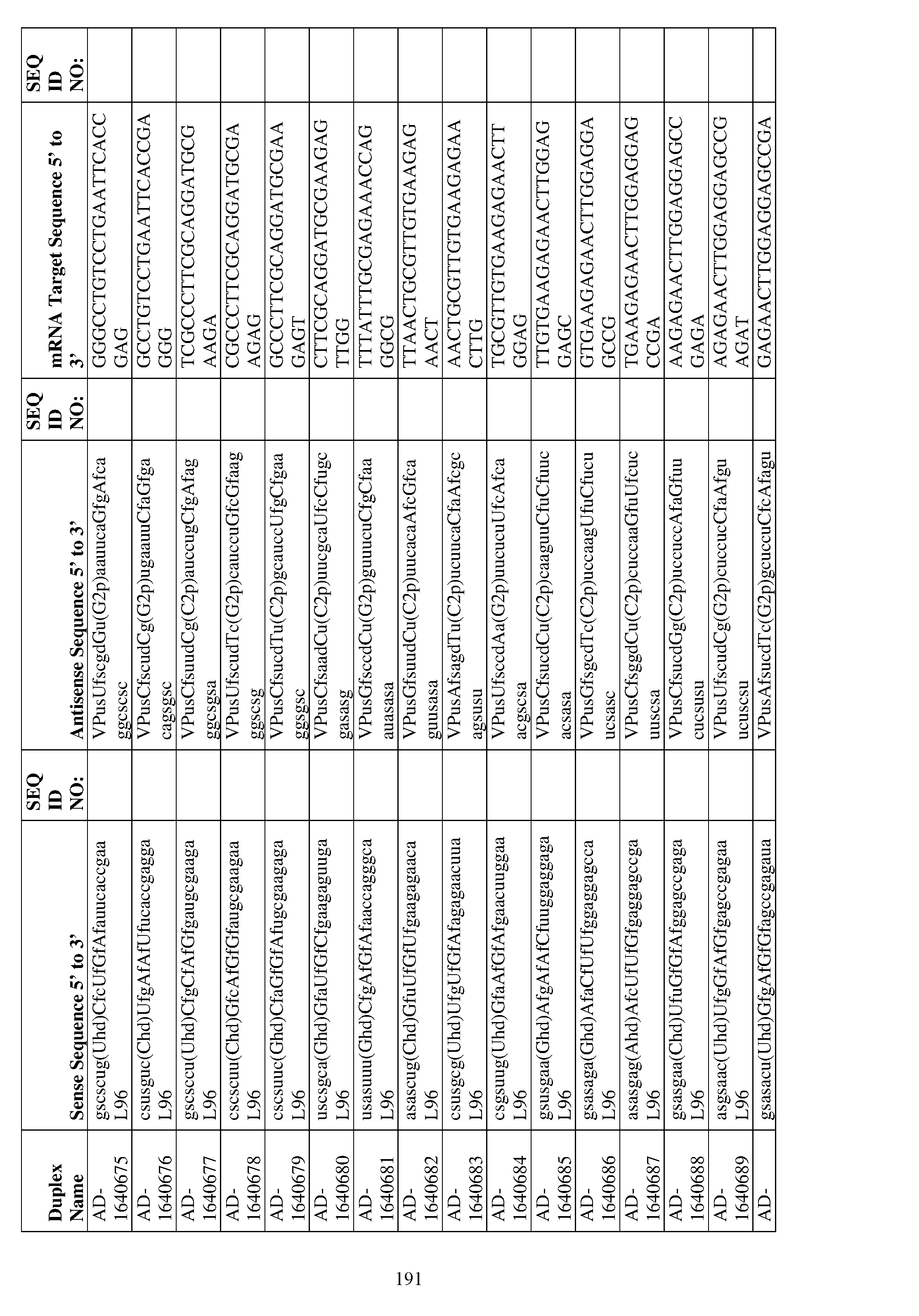 [0051] In some embodiments, the sense strand comprises a 2’-fluoro nucleotide at positions 7, 9, 10 and 11, counting from the 5’-end of the sense strand or at positions 11, 12, 13 and 15, counting from the 3’-end of the sense strand. [0052] In some embodiments, the sense strand comprises a 2’-fluoro nucleotide at positions 9, 10, and 11, counting from the 5’-end of the sense strand or at positions 11, 12, and 13 counting from the 3’-end of the sense strand. [0053] In some embodiments, the antisense strand comprises at least one, e.g., 2, 3, 4, 5, 6, 7 or more DNA nucleotides. [0054] In some embodiments, the antisense strand comprises a DNA nucleotide at positions 2, 5, 7, and 12, counting from the 5’-end of the antisense strand. [0055] In some embodiments, the antisense strand comprises a DNA nucleotide at positions 2, 5, 7, 12, and 14 counting from the 5’-end of the antisense strand. [0056] In some embodiments,the antisense strand a DNA nucleotide at positions 2, 5, 7, and 12, and a 2’-fluoro nucleotide at position 14 counting from the 5’-end of the antisense strand. [0057] In some embodiments, the antisense strand a DNA nucleotide at positions 2, 5, 7, 12, 14 and 16 counting from the 5’-end of the antisense strand. [0058] In some embodiments, the dsRNA comprises at least one thermally destabilizing modification. [0059] In some embodiments, the antisense strand comprises at least one thermally destabilizing modification. [0060] In some embodiments, the antisense strand comprises at least one thermally destabilizing modification in the seed region (i.e., positions 2-9 from the 5’-end) of the antisense strand. [0061] In some embodiments,he antisense strand comprises a thermally destabilizing modification at least at one of positions 6, 7 or 8, counting from the 5’-end of the strand. [0062] In some embodiments,the antisense strand comprises a thermally destabilizing modification at position 7, counting from the 5’-end of the strand. [0063] In some embodiments, the thermally destabilizing modification is an abasic nucleotide, 2’-deoxy nucleotides, acyclic nucleotide (e.g., unlocked nucleic acid (UNA), glycol nucleic acid (GNA) or (S)-glycol nucleic acid (S-GNA)), a 2’-5’ linked nucleotide (3’-RNA), threose nucleotide (TNA), 2’ gem Me/F nucleotide or mismatch with an opposing nucleotide in the other strand. T