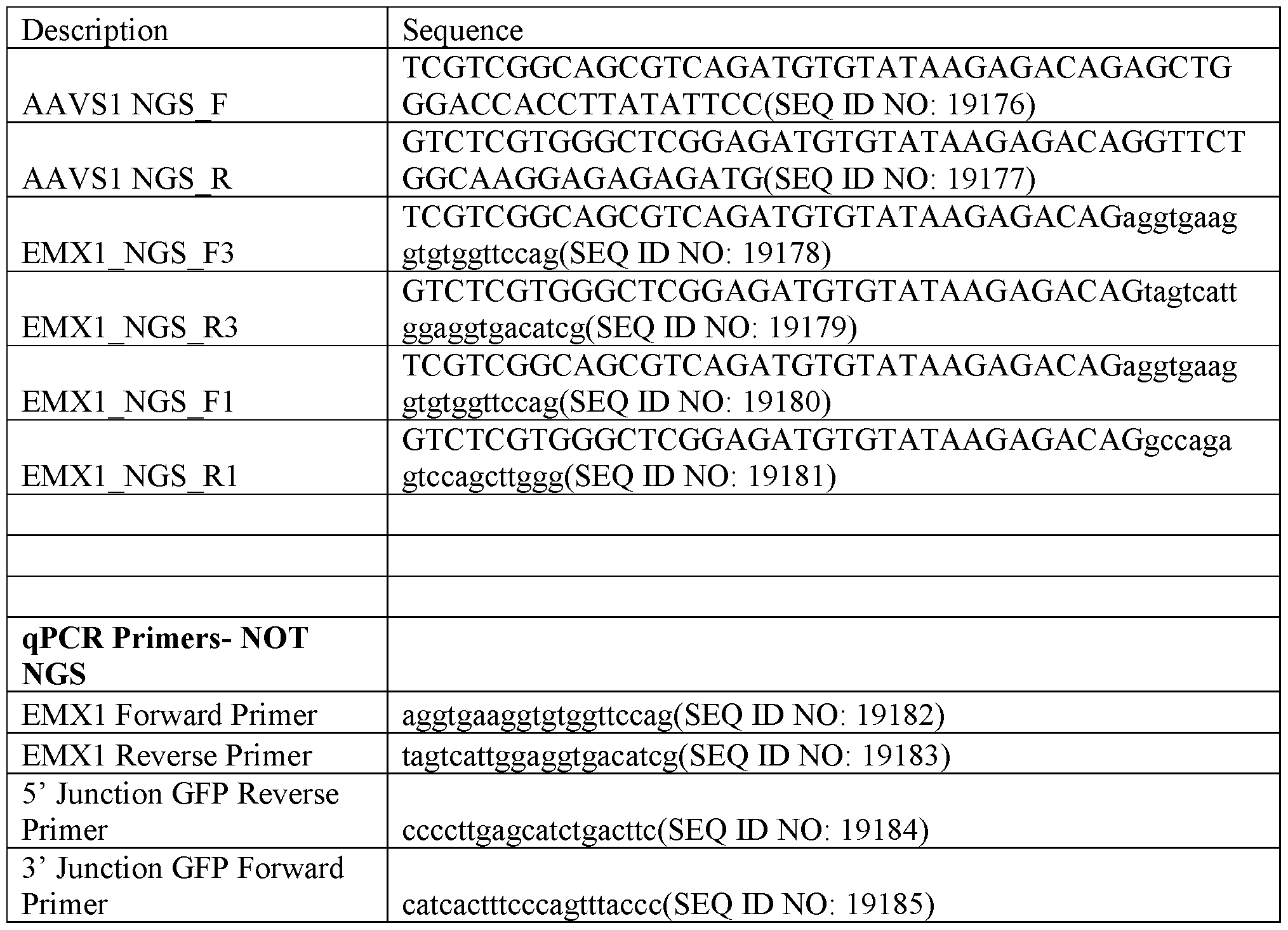 30 seconds, 55ºC for 30 seconds, and 72ºC for 30 seconds], followed by a final 72ºC extension for 5 minutes. PCR2 reactions were purified by SequalPrep Normalization plate kit (Thermo Fisher Scintific) and pooled. Size and purity were evaluated by Tape station D1000 assay (Agilent). DNA concentration was measured by fluorometric quantification (Qubit, ThermoFisher Scientitfic) and libraries were sequenced with 30% PhiX sequencing control on an Illumina NextSeq 2000 instrument using P1 or P2300 cycle kit. Sequencing reads were demultiplexed and alignment of amplicon sequences to a reference sequence was performed using CRISPresso2. CRISPresso2 was run in HDR mode using the desired allele as the expected allele and precise editing yield was calculated as the number of HDR aligned reads divided by total aligned reads. [001124] Junction qPCR for GFP integration qPCR was used to determine presence of GFP at the EMX1 locus post editing. Primers were designed to flank the 5’ and 3’ junction of GFP insertion at EMX1 locus. Briefly, 25 µl qPCR reactions were performed with 12.5 µl of KAPA HiFi HotStart ReadyMix (Roche), 0.3 µM of each forward and reverse primer, 2 µl of gDNA, 1X of SYBR Green (Thermo Fisher Scientific: S7563), and 1X of Rox Reference Dye (Thermo Fisher Scientific:54881). qPCR reactions were carried out as follows: 50 ◦C for 2 minutes, 95◦C for 3 minutes, then 40 cycles of [98◦C for 30 seconds, 67◦C for 30 seconds, and 72◦C for 30 seconds], 72◦C extension for 2 minutes, followed by a melt curve analysis with 95 ◦C for 15 seconds, 60 ◦C for 1 minute and 95 ◦C for 1 second. Delta Ct was obtained by subtracting edited samples’ Ct value from negative/unedited samples’ Ct value to relatively quantify GFP insertion at EMX1 locus. Additionally, qPCR samples were run on Tapestation 4200 (Agilent) with High-Sensitivity D1000 Reagents (Agilent) to confirm band size at expectation. [001125] Plasmid based gene editing Plasmids encoding retrons were synthesized by Twist Bioscience. For transfections, 25,000293T-Cas9 cells (Genecopoeia: SL502) were transfected using Lipofectamine 3000 (Thermofisher: L3000001) according to the manufacturer’s protocol. Transfected cells were incubated at 37ºC for 72 hrs before lysis in prepGEM reagent (Thomas Scientific: PUN0050) according to the manufacturer’s protocol. A 1 uL aliquot of crude lysate was used as template for amplification of the EMX1 CRISPR target site by PCR. Illumina adaptors and UDIs were added in a second round of PCR before loading
