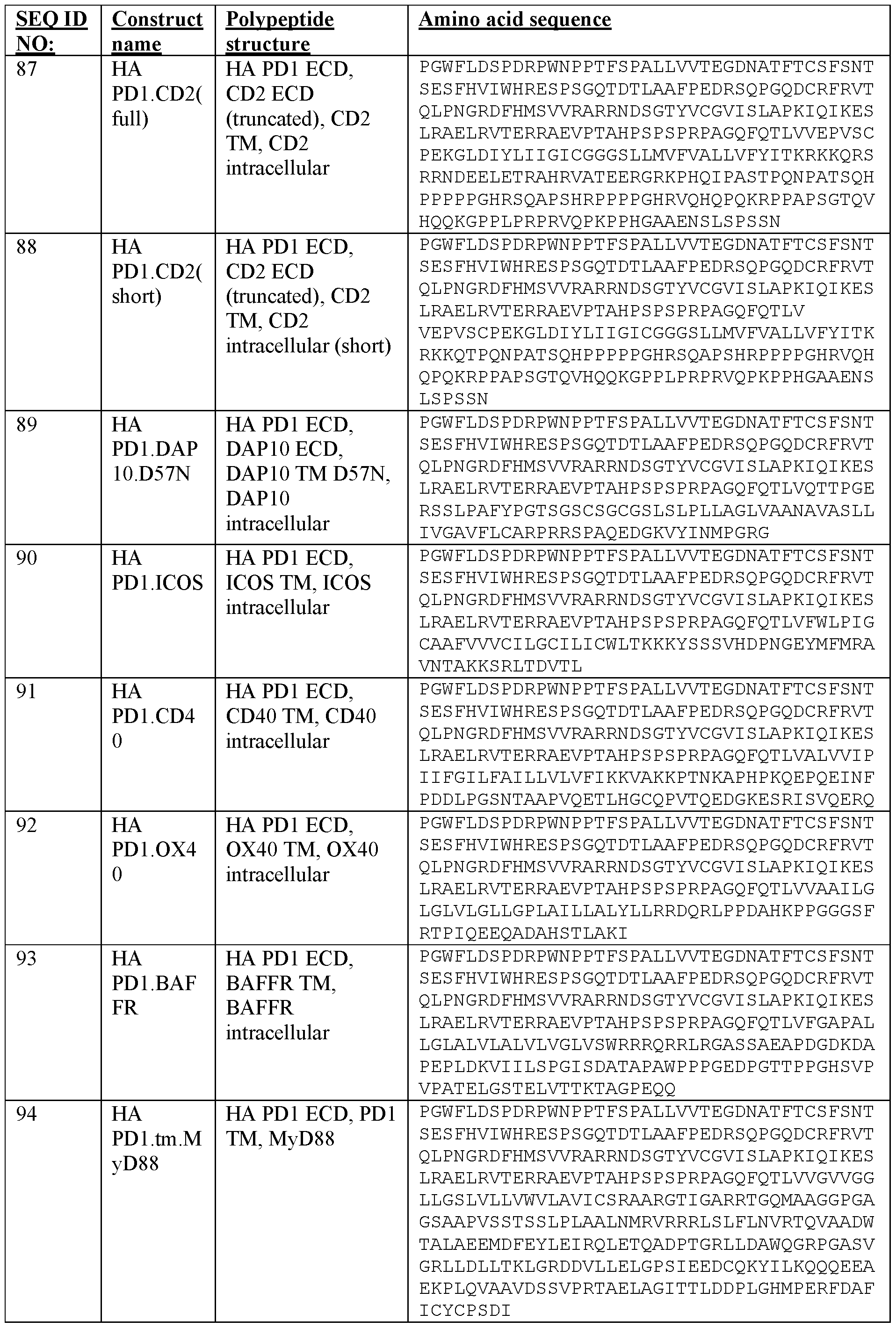 - chimeric polypeptides specifically chimeric switch receptors, which are fusion proteins comprising an ectodomain and/or transmembrane domain derived from an inhibitory receptor (e.g. PD1 or TGFbR2 (TGF beta receptor II)) fused to the transmembrane domain and/or intracellular signaling domain derived from one or more costimulatory proteins (e.g. CD2, CD28, MyD88, DAP 10 or ICOS).