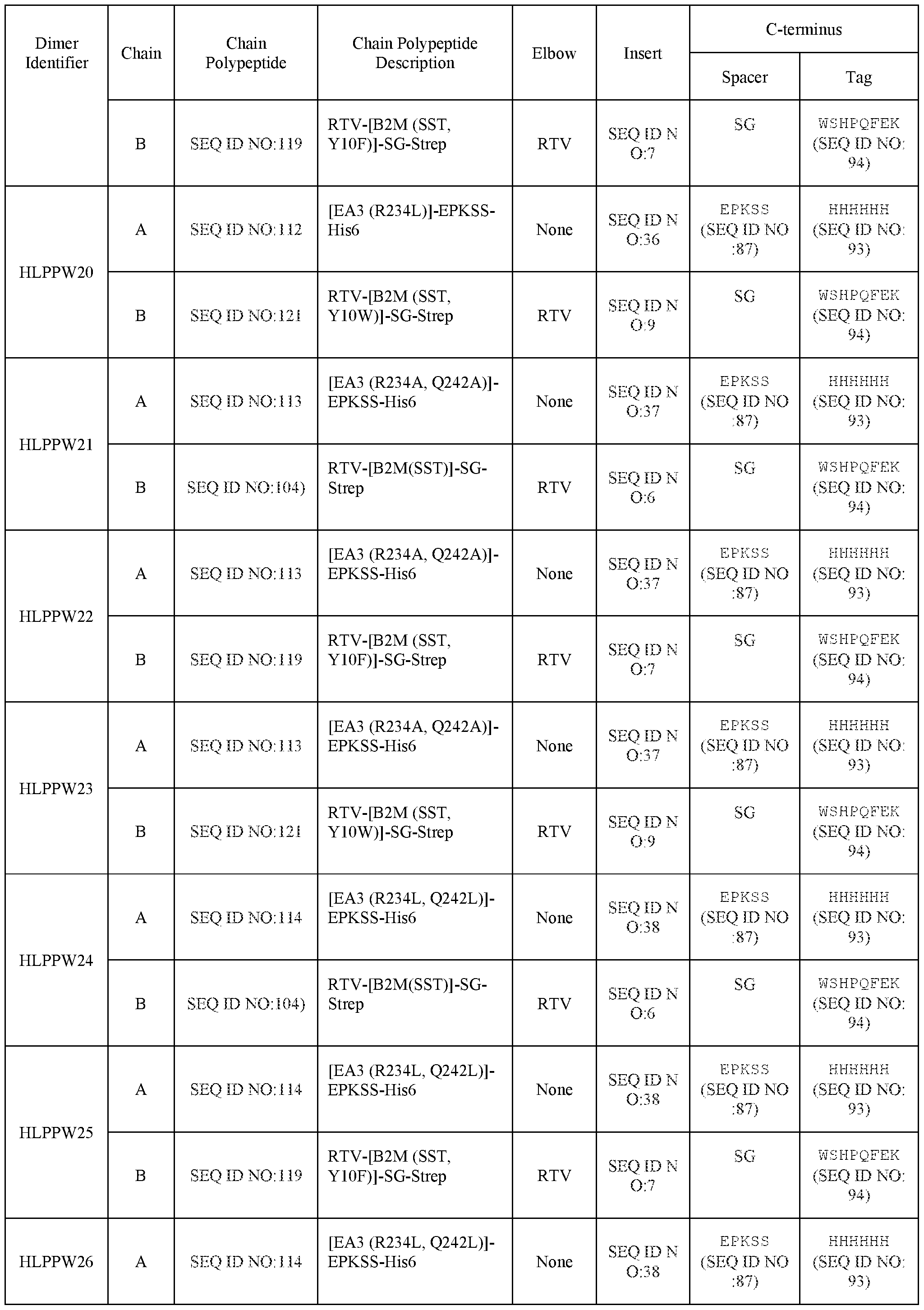 - the first light chain dimerization domain comprises or consists of an amino acid sequence of a human B2M sequence as set forth in SEQ ID NO:2 but comprising a set of substitutions of F56S, W60S, and F62T with positions numbered according to the B2M amino acid numbering in TABLE 1, optionally further comprising one, two, three, four, or five single amino acid substitutions at positions K6, Y10, R12, D98, or M99 with positions numbered according to the B2M amino acid numbering in TABLE 1.