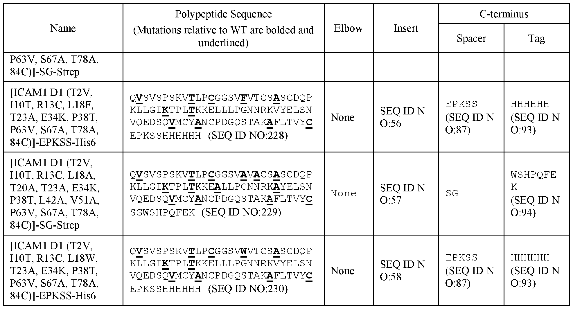 - the first light chain dimerization domain comprises the first ICAM-1 D1 domain and the first heavy chain dimerization domain comprises the second ICAM-1 D1 domain, wherein the first and second ICAM-1 D1 domains bind to each other to form a dimer, and wherein the first ICAM-1 D1 domain or second ICAM-1 D1 domain comprises or consists of an amino acid sequence having 1, 2, 3, 4, 5, 6, 7, 8, 9, 10, 11, 12, 13, 14, or 15 single amino acid substitutions to the sequence of SEQ ID NO:49 at one or more amino acid positions 2, 10, 13, 18, 20, 23, 34, 38, 42, 49, 51, 53, 63, 67, and 78 of SEQ ID NO:49, wherein each of the single amino acid substitutions is independently selected from the group consisting of V, T, F, W, A, K, E, C, and R, optionally further comprising a C-terminal cysteine amino acid addition.