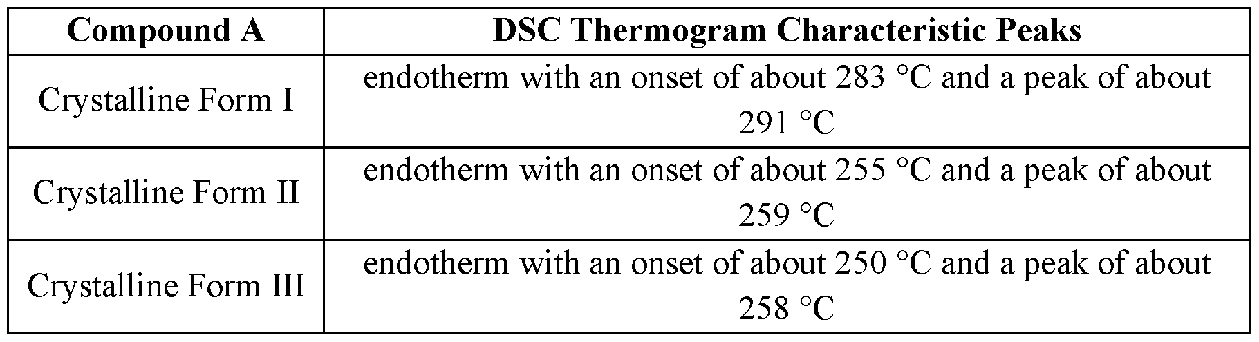 - Crystalline Form I is characterized by a differential scanning calorimetry (DSC) thermogram comprising an endotherm in the range of about 280–295 °C. In some embodiments, Crystalline Form I is characterized by a differential scanning calorimetry (DSC) thermogram comprising an endotherm with an onset of about 283 °C and a peak of about WSGR Docket No.43629-723.601 291 °C. In some embodiments, Crystalline Form I is characterized by a differential scanning calorimetry (DSC) thermogram substantially the same as shown in Figure 2.