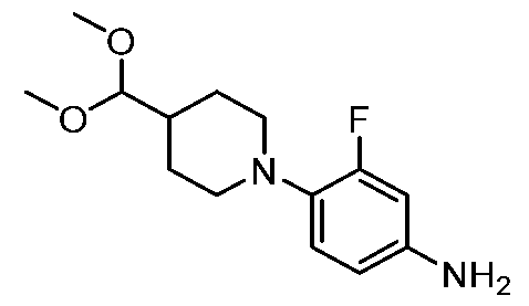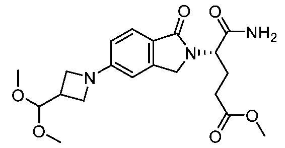 [00511] To a mixture of tert-butyl (4S)-4-(5-bromo-7-fluoro-1-oxo-3H-isoindol-2-yl)- 4-carbamoylbutanoate (500 mg, 1 mmol), 3-(dimethoxymethyl)azetidine (158 mg, 1 mmol) and cesium fluoride (549 mg, 3.6 mmol) in 1,4-dioxane (20 mL) was added dichloro[1,3- bis(2,6-di-3-pentylphenyl)imidazol-2-ylidene](2-methylpyridyl)palladium(II) (50.6 mg, 0.06 mmol) in portions, the resulting mixture was stirred for 3 h at 70 °C under nitrogen atmosphere. The mixture was cooled to room temperature, diluted with water (80 mL) and extracted with ethyl acetate (2 x 100 mL). The combined organic layers were washed with brine (2 x 20 mL), dried over anhydrous sodium sulfate, filtered, and concentrated. The crude product was purified by silica gel chromatography (petroleum ether/ethyl acetate = 3:1 to 1:100) to afford tert-butyl (4S)-4-carbamoyl-4-{5-[3-(dimethoxymethyl)azetidin-1-yl]-7- fluoro-1-oxo-3H-isoindol-2-yl}butanoate (260 mg, 46%) as a white solid.