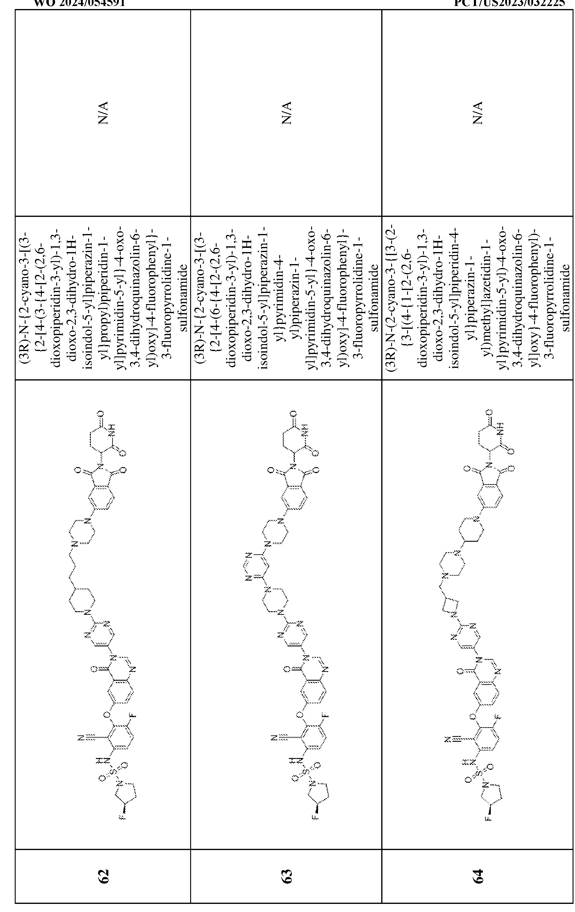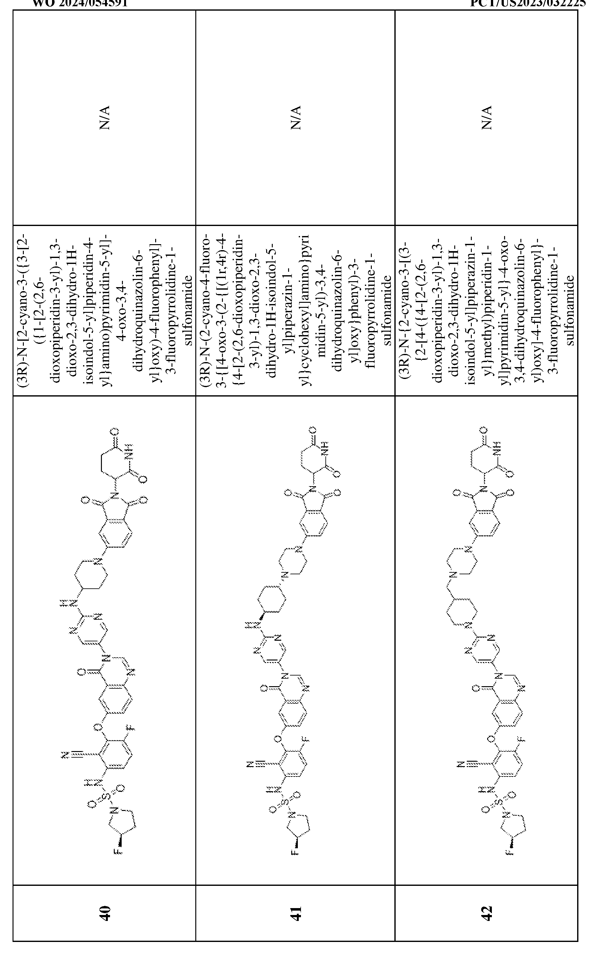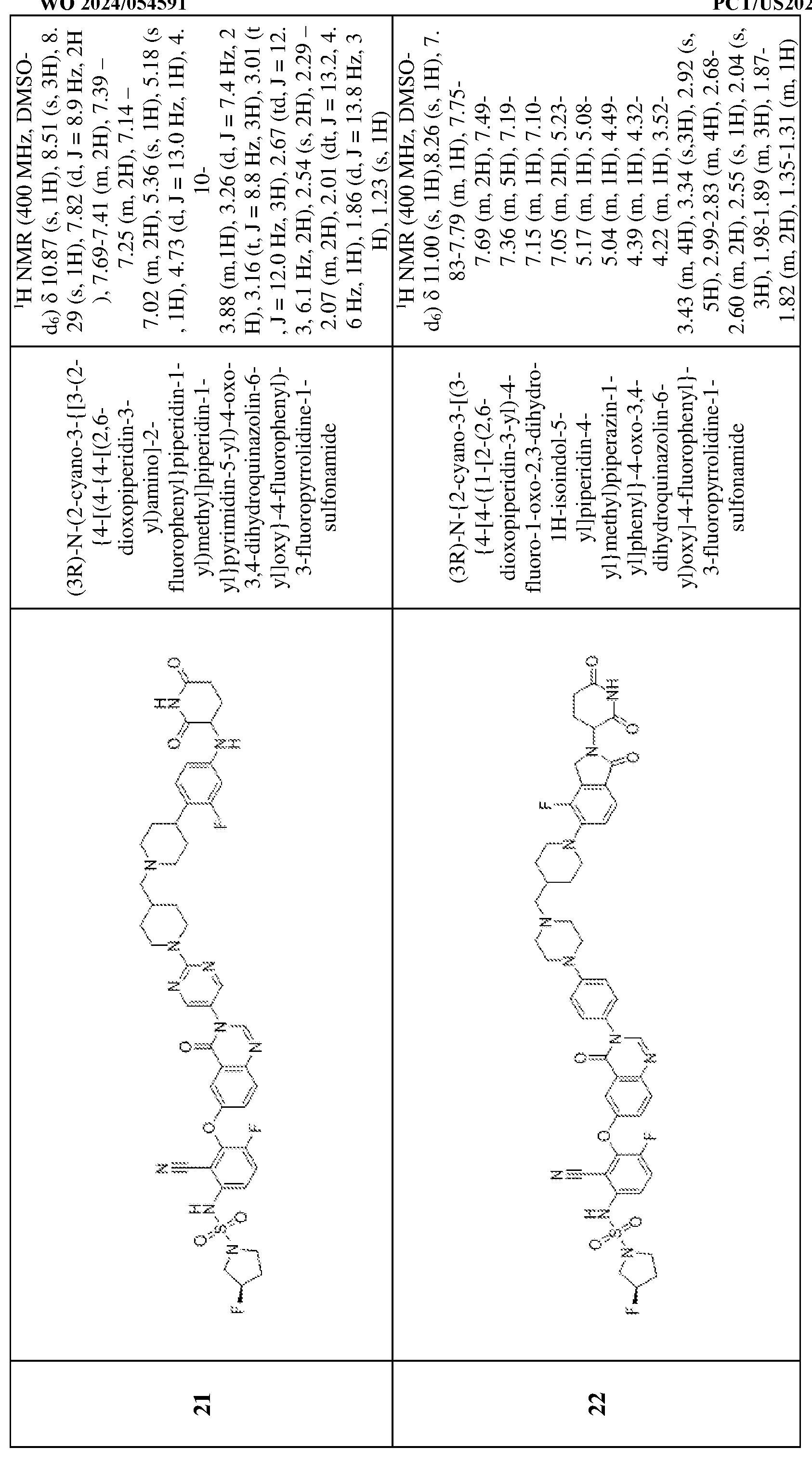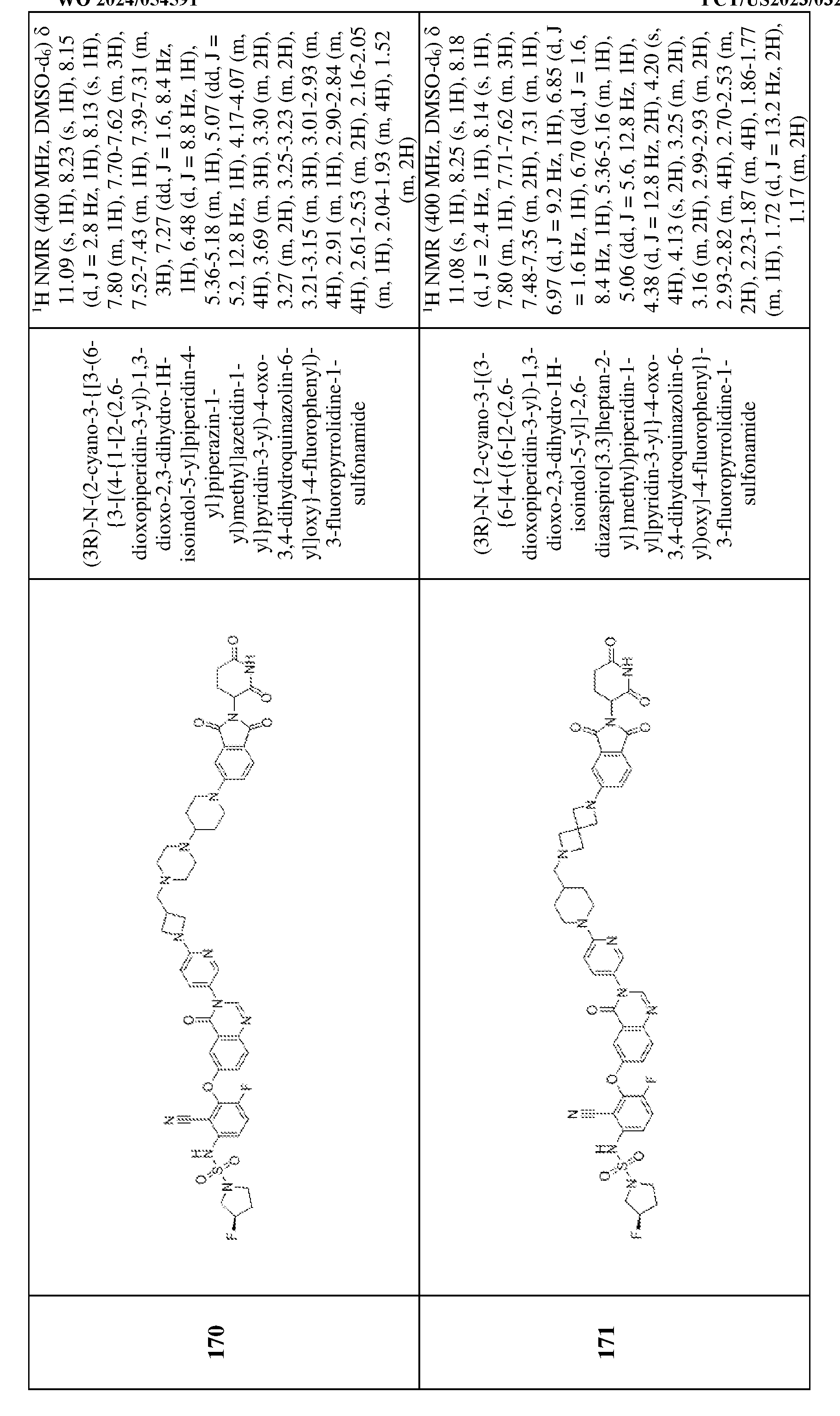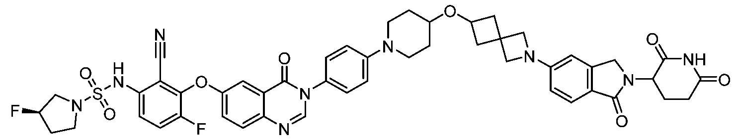 [00538] To a solution of 3,6-difluoro-2-{[4-oxo-3-(4-{1-[(1r,3r)-3-({1-[2-(2,6- dioxopiperidin-3-yl)-1-oxo-3H-isoindol-5-yl]piperidin-4-yl}oxy)cyclobutyl]piperidin-4- yl}phenyl)quinazolin-6-yl]oxy}benzonitrile (100 mg, 0.1 mmol) and (3R)-3- fluoropyrrolidine-1-sulfonamide (19.7 mg, 0.1 mmol) in N,N-dimethylformamide (20 mL) was added cesium carbonate (114.5 mg, 0.3 mmol). The resulting mixture was stirred for 12 h at 50 °C under nitrogen atmosphere. The reaction mixture was cooled to room temperature, diluted with water (100 mL) and extracted with dichloromethane (3 x 20 mL). The combined organic layers were washed with brine (10 mL), dried over anhydrous sodium sulfate, filtered, and concentrated. The residue was purified by preparative thin layer chromatography (dichloromethane/methanol = 10:1) to afford (3R)-N-(2-cyano-4-fluoro-3-{[4-oxo-3-(4-{1- [(1r,3r)-3-({1-[2-(2,6-dioxopiperidin-3-yl)-1-oxo-3H-isoindol-5-yl]piperidin-4- yl}oxy)cyclobutyl]piperidin-4-yl}phenyl)quinazolin-6-yl]oxy}phenyl)-3-fluoropyrrolidine-1- sulfonamide (9.6 mg, 7.4%) as an off-white solid. MS (ESI): m/z 1001.4 [M+H]