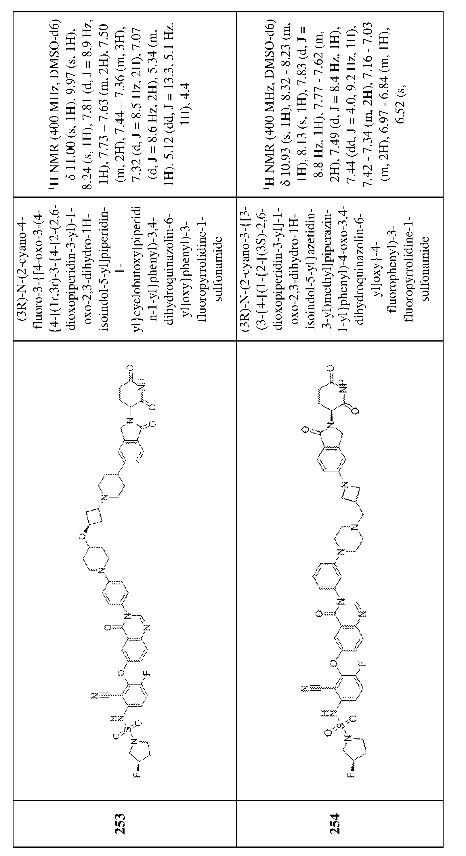 1H NMR (400 MHz, DMSO-d6) δ 10.94 (s, 1H), 8.53 (s, 1H), 7.97 (s, 1H), 7.83 (d, J = 8.8 Hz, 1H), 7.68 (dd, J = 2.4, 8.8 Hz, 1H), 7.58 (t, J = 10 Hz, 1H), 7.51 (d, J = 8.4 Hz, 1H), 7.47-7.37 (m, 2H), 7.10-7.02 (m, 2H), 6.66 (s, 1H), 5.40-5.18 (m, 1H), 5.04 (dd, J = 4.8, 13.2 Hz, 1H), 4.46-4.27 (m, 2H), 4.24-4.15 (m, 1H), 3.90 (d, J = 12.0 Hz, 2H), 3.48-3.43 (m, 2H), 3.28-3.20 (m, 4H), 2.92-2.80 (m, 3H), 2.75-2.54 (m, 5H), 2.42-2.30 (m, 1H), 2.17 (s, 4H), 2.08 (d, J = 8.0 Hz, 2H), 1.98-1.88 (m, 2H), 1.82 (d, J = 12.0 Hz, 2H), 1.32-1.17 (m, 2H). [00520] Example 249: Exemplary synthesis of (3R)-N-(2-cyano-4-fluoro-3-{[4-oxo- 3-(4-{1-[(1r,3r)-3-({1-[2-(2,6-dioxopiperidin-3-yl)-1-oxo-2,3-dihydro-1H-isoindol-5- yl]piperidin-4-yl}oxy)cyclobutyl]piperidin-4-yl}phenyl)-3,4-dihydroquinazolin-6- yl]oxy}phenyl)-3-fluoropyrrolidine-1-sulfonamide [00521] Step 1: tert-butyl 4-[4-(6-hydroxy-4-oxoquinazolin-3-yl)phenyl]piperidine-1- carboxylate