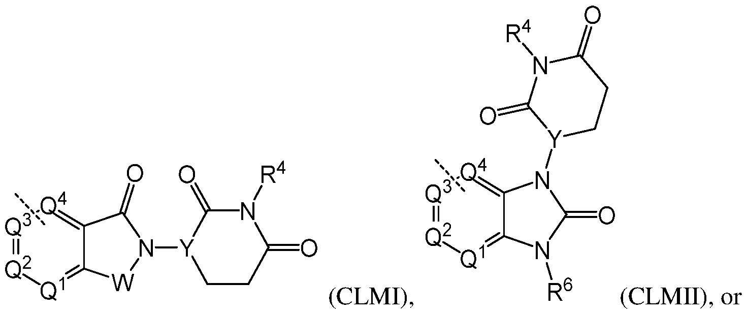 dcates the point of attachment to the chemical linking moiety (L); (b) CLM is an E3 ubiquitin ligase binding moiety that binds a cereblon E3 ubiquitin ligase such as e.g., one represented by the chemical structure: