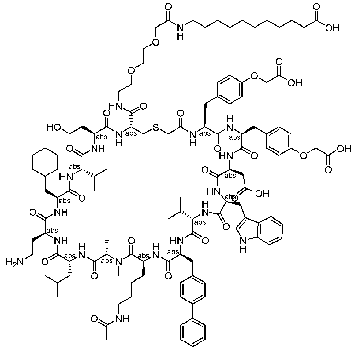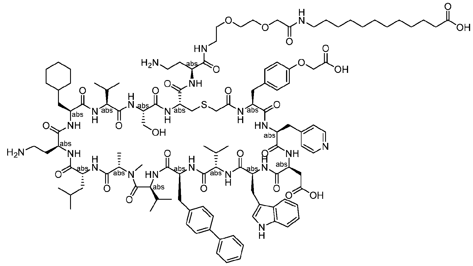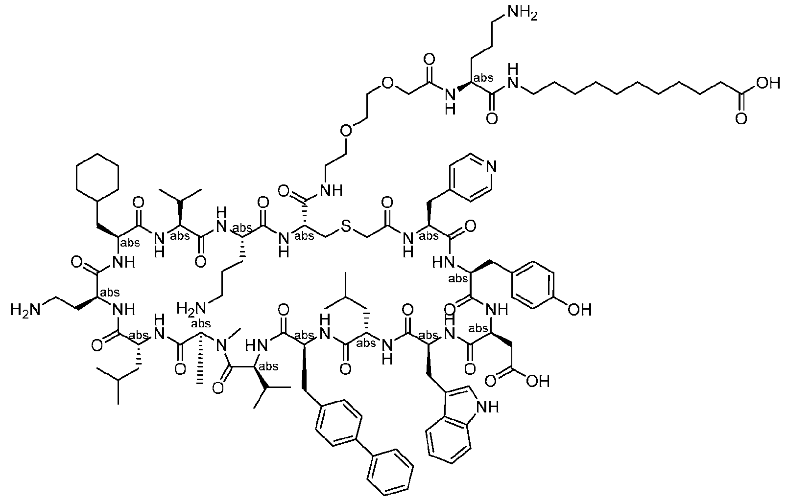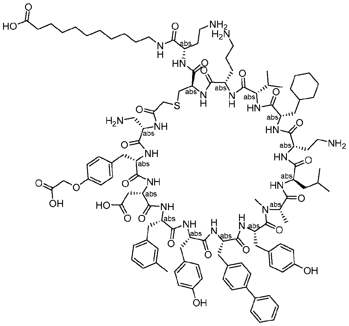 - R 9 is C 1 -C 6 alkyl or aminoC 1 -C 6 alkyl. [0028] In some aspects, R 9 is isobutyl. [0029] In some aspects, R 10 is aminoC 1 -C 6 alkyl or heteroarylC 1 -C 6 alkyl. [0030] In some aspects, the heteroaryl in heteroarylC 1 -C 6 alkyl is imidazolyl. [0031] In some aspects, R 11 is C 1 -C 6 alkyl or cyclohexylmethyl.