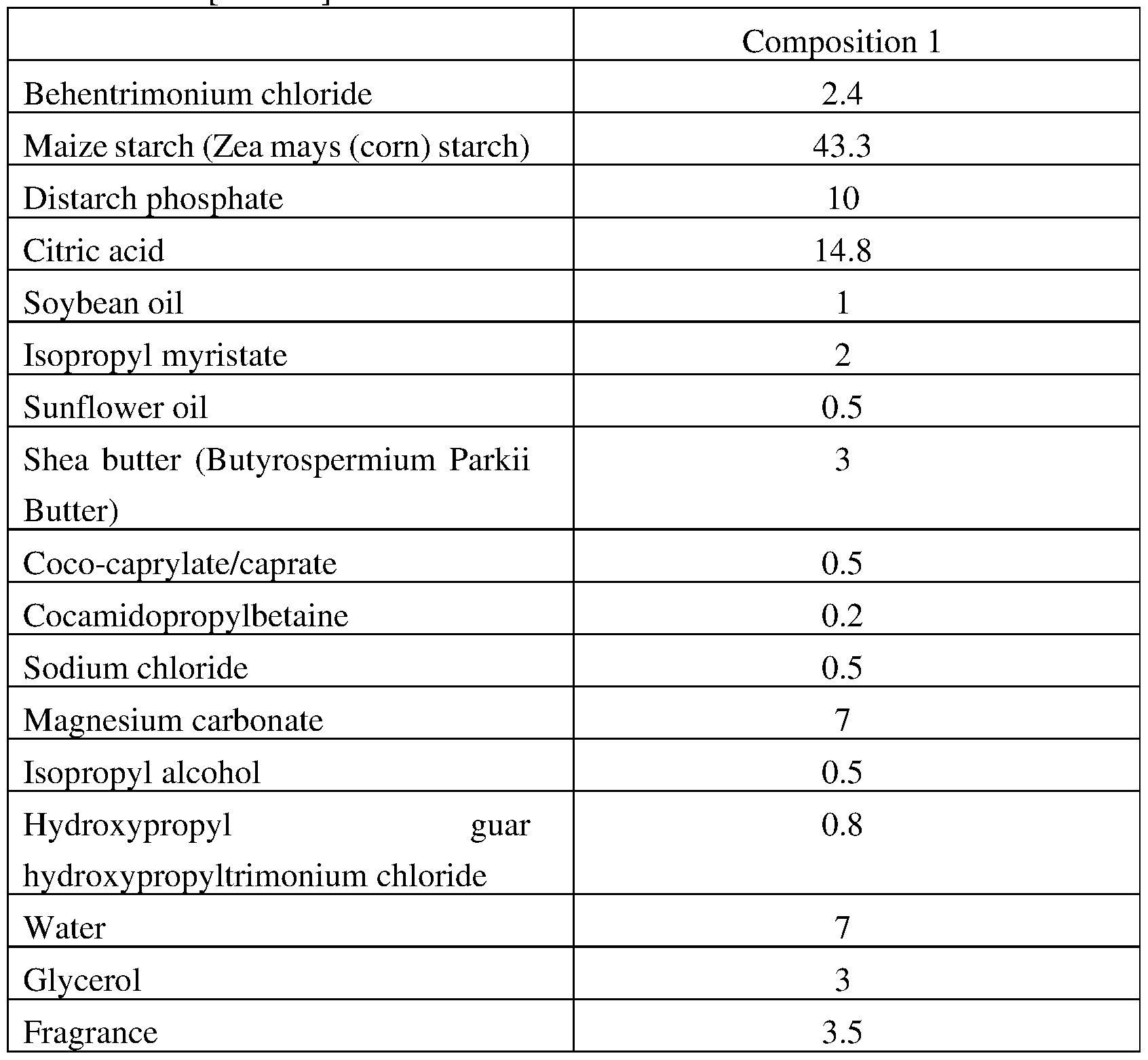 - the composition thus obtained has a cohesion or granulation such that the uptake and measuring-out properties are improved, while at the same time avoiding undesired agglomerates which have a negative impact on the working qualities.