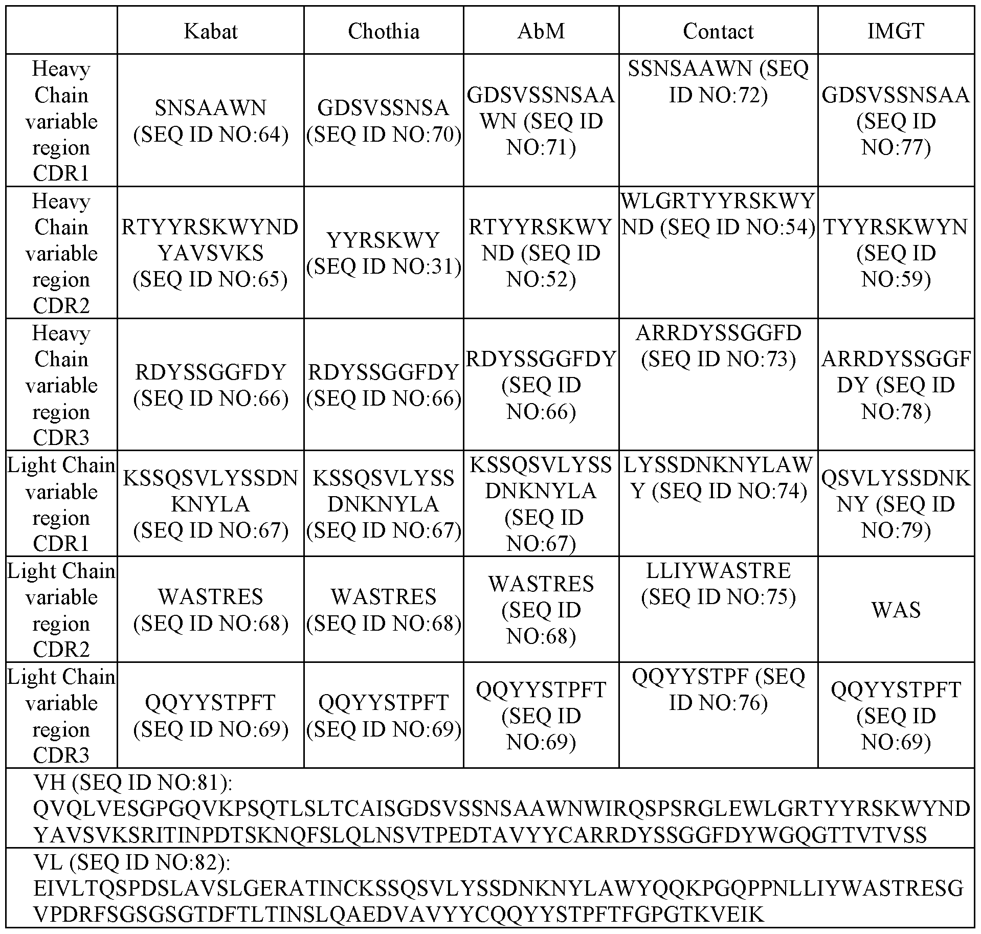- the antigen binding region comprises a VH domain comprising a HCDR1, HCDR2, and HCDR3 as set forth in SEQ ID NO:81, and a VL domain comprising a LCDR1, LCDR2, and LCDR3 as set forth in SEQ ID NO:82.