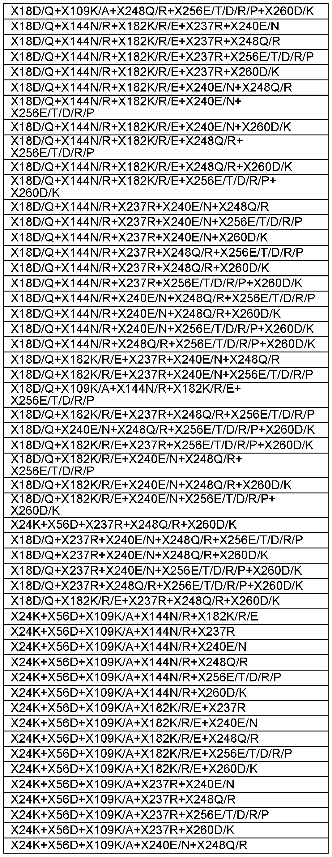 - Variants comprising multiple substitutions are separated by “+”, e.g., “Arg170Tyr+Gly195Glu”, “R170Y+G195E” or “X170Y+X195E” representing a substitution of arginine and glycine at positions 170 and 195 with tyrosine and glutamic acid, respectively.