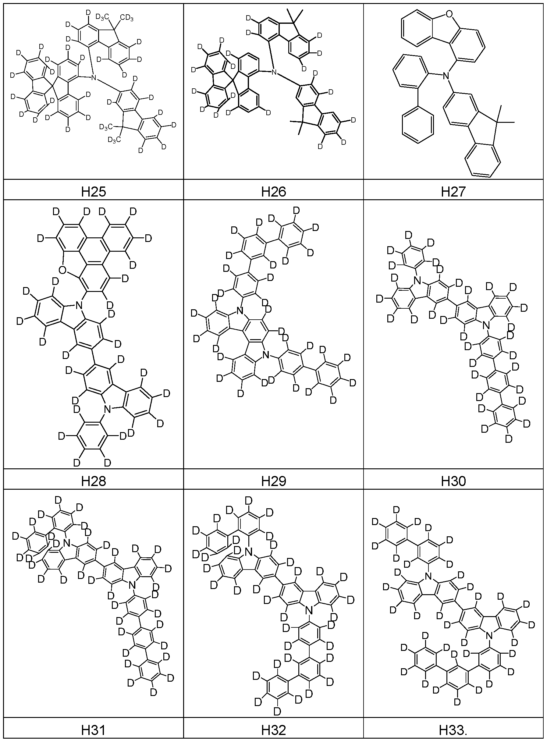 - R is, at each occurrence, identically or differently selected from the group consisting of D, F, CN, Si(aryl)s, a straight-chain alkyl group having 1 to 20 C atoms or a branched or cyclic alkyl group having 3 to 20 C atoms, where one or more non-adjacent CH2 groups may be replaced by O or S and where one or more H atoms may be replaced by D, F or CN, where the compound of formula (1) is partially or fully deuterated.