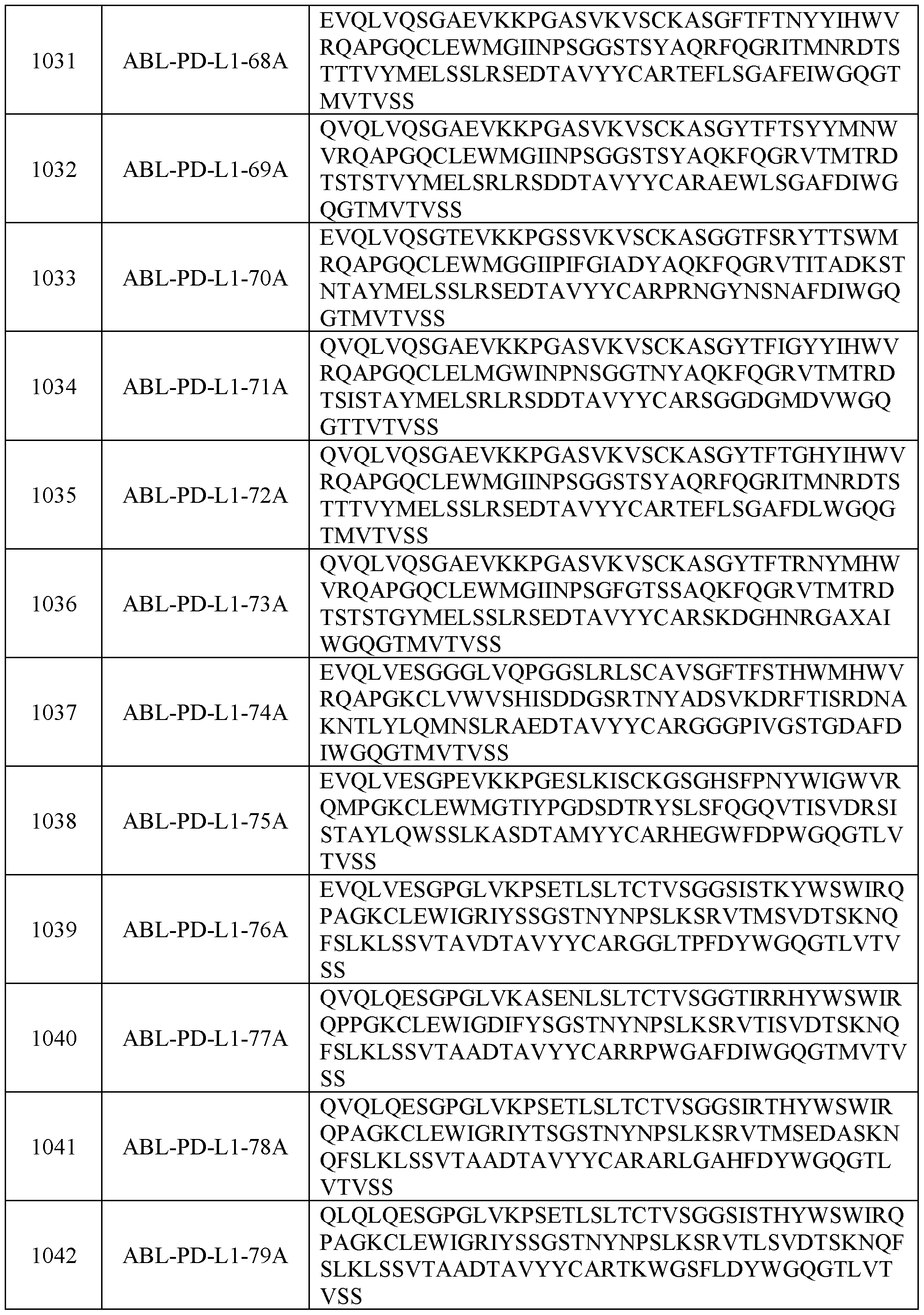 - the CDRs, VH, and/or VL regions are from an antibody selected from the group consisting of ABL-PD-L1-1 to ABL-PD-L1-107 and ABL-PD-L1-1A to ABL-PD-L1-107A.