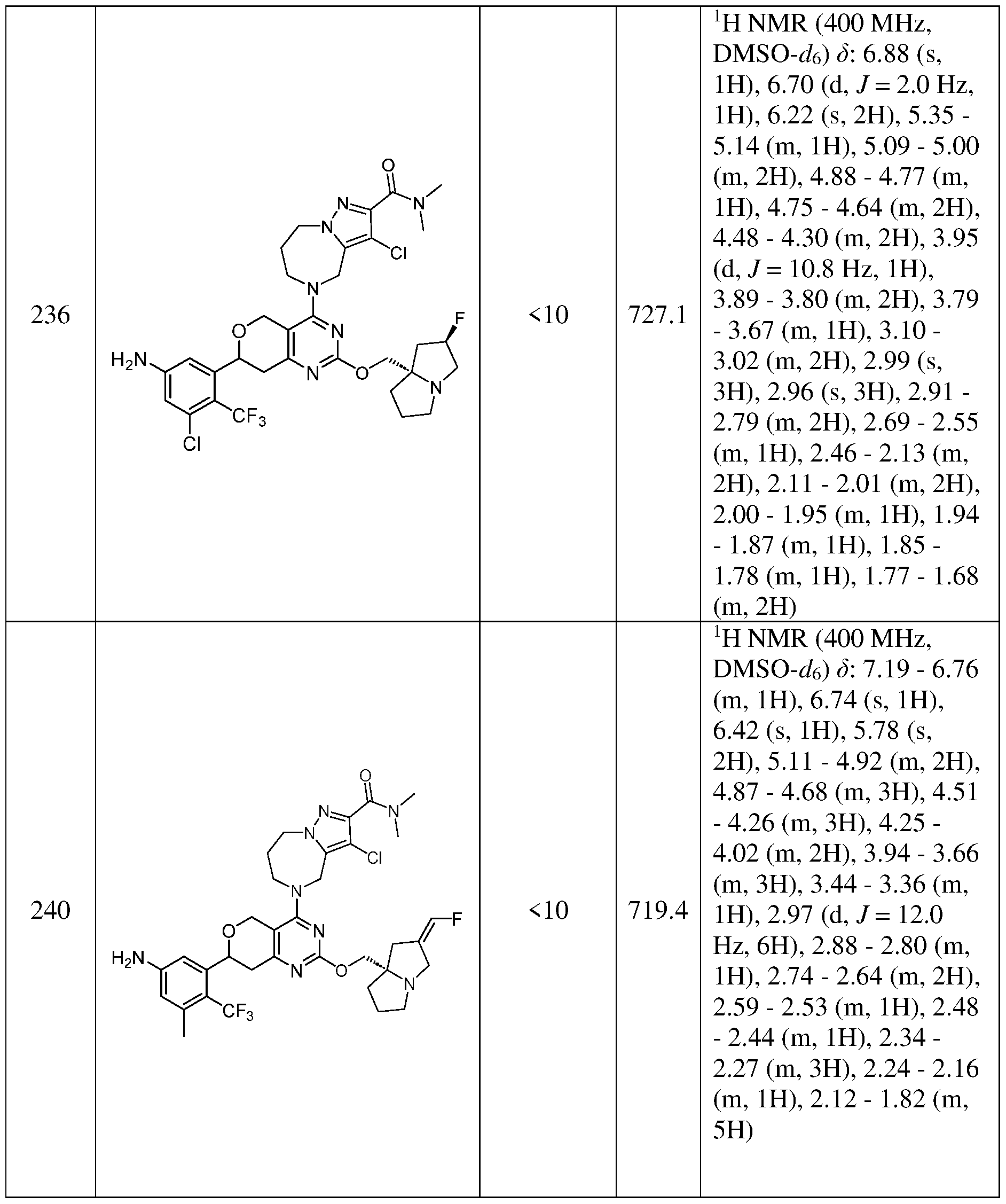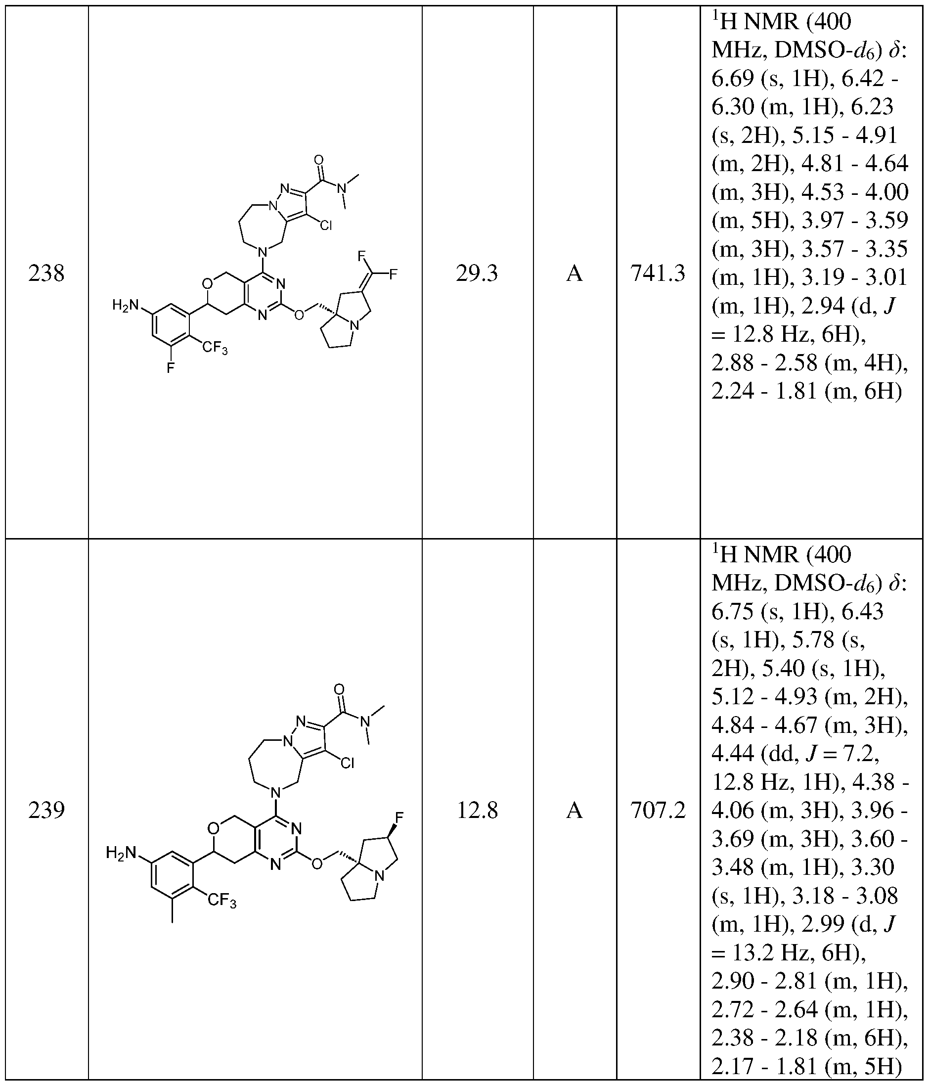 [0353] A mixture of 5-(2- { [(2Z,7aS)-2-(fluoromethylidene)-tetrahydro- lH-pyrrolizin-7a- yl]methoxy } -7-(5- { bis [(4-methoxyphenyl)methyl] amino } -3-chloro-2- (trifluoromethyl)phenyl)-5H,7H,8H-pyrano[4,3-d]pyrimidin-4-yl)-N-methoxy-N,3-dimethyl- 4H,6H,7H,8H-pyrazolo[l,5-a][l,4]diazepine-2-carboxamide(100 mg, 0.1 mmol, 1.0 eq.) in DCM:TFA=1:1 (4 mL) was stirred at 23 °C for 1 h. The reaction was concentrated in vacuo to give a residue. Then the residue was purified by HPLC(H20(0.1%TFA)/ACN=80%/20% to 70%/20%) to give 5-(7-(5-amino-3-chloro-2-(trifluoromethyl)phenyl)-2-(((S,Z)-2- (fluoromethylene)tetrahydro-lH-pyrrolizin-7a(5H)-yl)methoxy)-7,8-dihydro-5H-pyrano[4,3- d]pyrimidin-4-yl)-N-methoxy-N,3-dimethyl-5,6,7,8-tetrahydro-4H-pyrazolo[l,5- a][l,4]diazepine-2-carboxamide (31 mg, 4.2% yield ) as white solid. ESLMS m/z = 735.2[M+1] +. Calculated MW: 734.2. JH NMR (400 MHz, MeOD) 5 6.99 (s, 0.5H), 6.96 (d, J = 2.1 Hz, 1H), 6.77 (d, J = 11.5 Hz, 0.5H), 6.73 (d, J = 2.2 Hz, 1H), 5.15 (d, J = 8.2 Hz, 1H), 5.05 (d, J = 13.7 Hz, 1H), 4.82 (d, J = 4.2 Hz, 4H), 4.50 (d, J = 21.0 Hz, 2H), 4.33 (m, 2H), 4.12 (d, J = 14.8 Hz, 1H), 3.97 (d, J = 14.0 Hz, 1H), 3.85 (d, J = 8.0 Hz, 1H), 3.74 (d, J = 18.1 Hz, 4H), 3.40 (s, 3H), 3.27 (d, J = 10.8 Hz, 1H), 2.96 (dd, J = 51.2, 17.1 Hz, 2H), 2.77 (t, J = 12.8 Hz, 2H), 2.27 (m, 6H), 2.14 (dd, J = 19.1, 12.1 Hz, 3H).