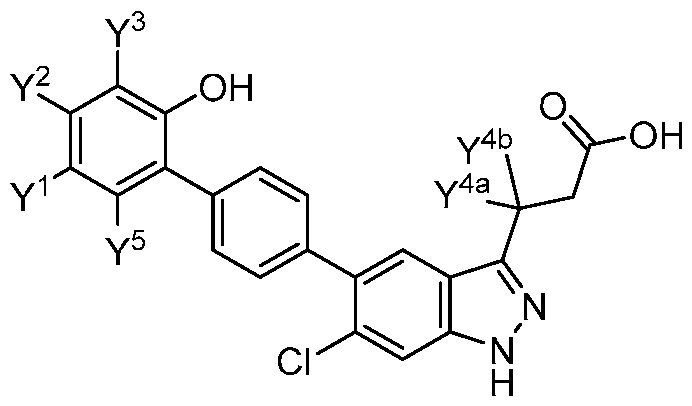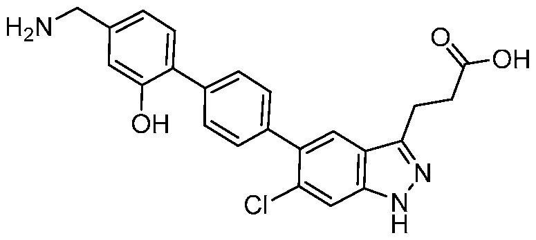 - the present invention further provides 3-[6-Chloro-5-(2'- hydroxy[1,1'-biphenyl]-4-yl)-1H-indazol-3-yl]propanoic acid.
