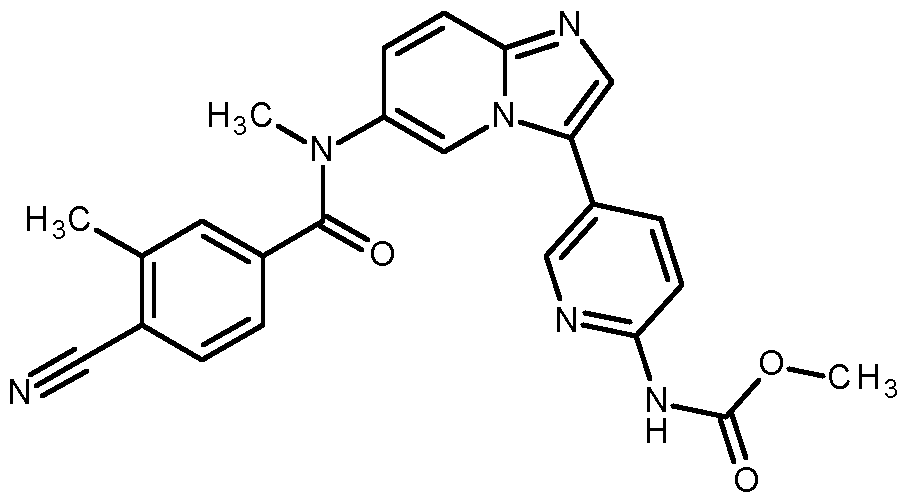 - the compound according to the present invention is selected from: methyl N-[5-[6-[(4-chloro-3-methoxy-benzoyl)-methyl-amino]-8-methyl-imidazo[1,2-a]pyridin-3-yl]-2- pyridyl]carbamate; methyl N-[5-[6-[(4-cyano-3-methyl-benzoyl)-methyl-amino]-8-methyl-imidazo[1,2-a]pyridin-3-yl]-2- pyridyl]carbamate; methyl N-[5-[6-[(2-methoxypyridine-4-carbonyl)-methyl-amino]-8-methyl-imidazo[1,2-a]pyridin-3-yl]-2- pyridyl]carbamate; methyl N-[5-[6-[(4-cyano-3-fluoro-benzoyl)-methyl-amino]-8-methyl-imidazo