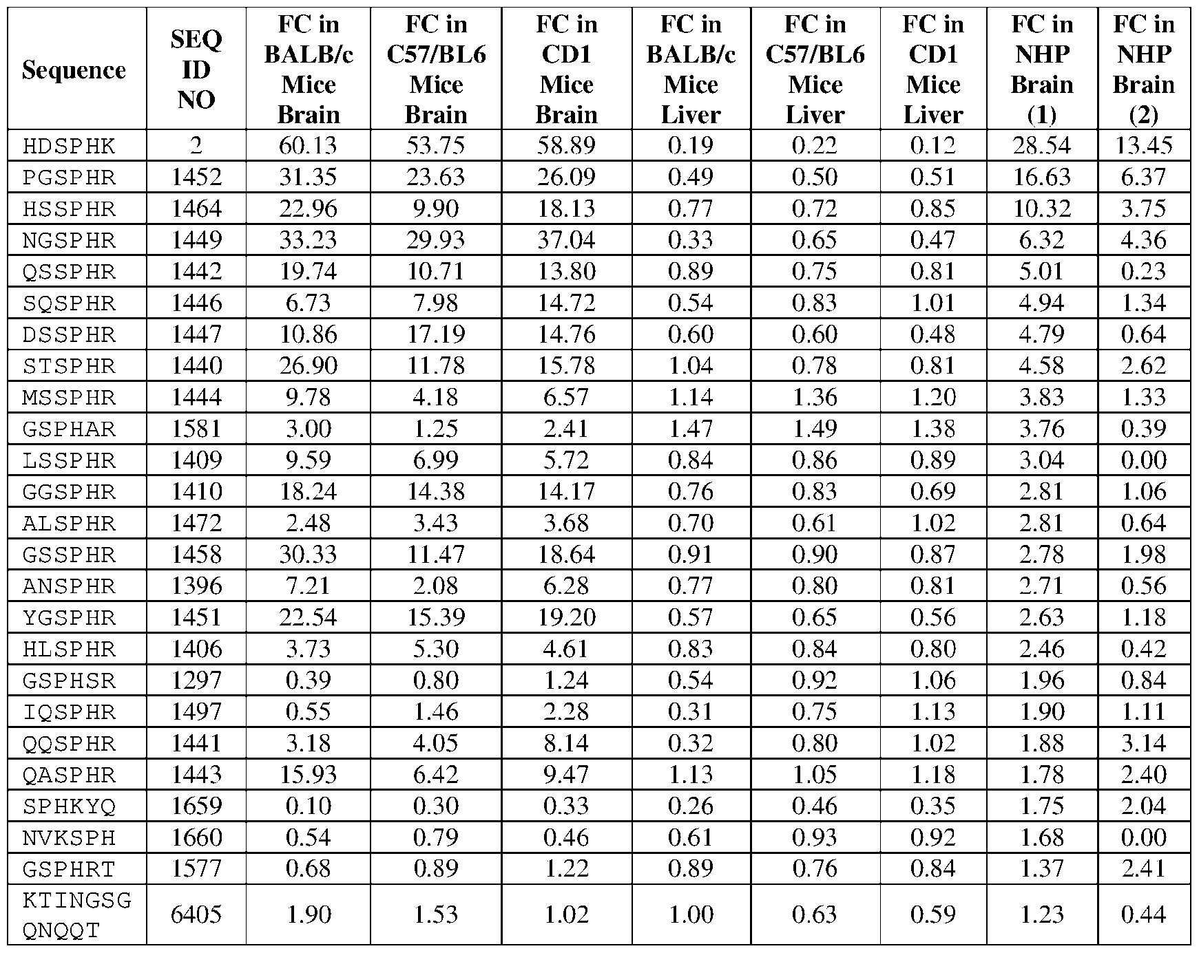 - the present disclosure provides an AAV capsid variant comprising the amino acid sequence of any one of SEQ ID NOs: 1102, 1138, 1140, 1209, 1286, 1291, 1296, 1297, 1305, 1311, 1320, 1321, 1338, 1347, 1349, 1358, 1365, 1379, 1382, 1384, 1387, 1390, 1391, 1396, 1406, 1407, 1409, 1410, 1411, 1423, 1427, 1431, 1434, 1440-1571, or 1573-1658, wherein the amino acid sequence is present immediately subsequent to position 453, numbered according to SEQ ID NO: 138 or 982.