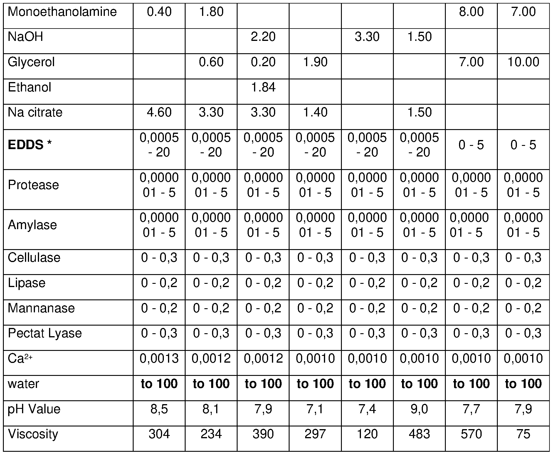 - the object of the present invention is to provide novel liquid cleaning compositions comprising (i) ethylenediamine-N,N'-disuccinic acid (EDDS) in an amount ranging from 0.0005% to 20% by weight of the composition; (ii) at least one enzyme in an amount ranging from 0.000001 % to 5% by weight of the composition, wherein the at least one enzyme is selected from the group consisting of amylase and protease; (iii) at least one anionic surfactant in an amount ranging from 0.1 % to 50% by weight of the composition; (iv) calcium (Ca 2+ ) in an amount ranging from 0.000001 % to 5% by weight of the composition; and (v) water, wherein the cleaning composition has a viscosity ranging from 20 to 10000 mPa*s measured with the relevant method in accordance with the description and a pH-value ranging between 4 and 14.