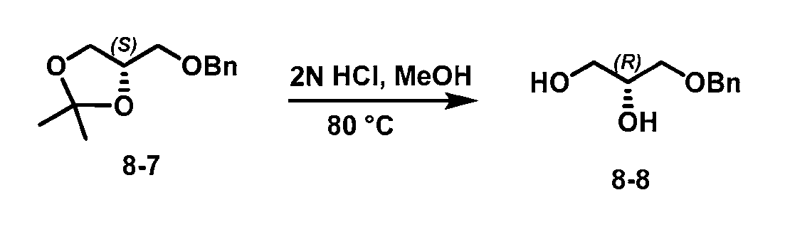 [0643] To a mixture of (S)-4-(benzyloxy)methyl)-2,2-dimethyl- 1.3 -dioxolane Intermediate 8-7 (11 .8 g, 53.1 mmol, 1 eq.) in MEOH (50 mL) was added hydrogen chloride (2.0 mL, 2.0M, 4.0 mmol, 0.075 eq ), and the reaction mixture was placed in a pre-heated oil bath (80 °C). The mixture was stirred for 2 hours. TLC showed no starting material left (EtOAc: Hexane =3: 7. Rf=0.1). The reaction mixture was concentrated in vacuo and re-dissolved in DCM (50 mL), dried with anhydrous Na2SO4. The solvent was evaporated, and the residue was co-evaporated with toluene, then dried under vacuum overnight, to yield Intermediate 8-8 as brownish oil (9.4 g, 97%, crude).