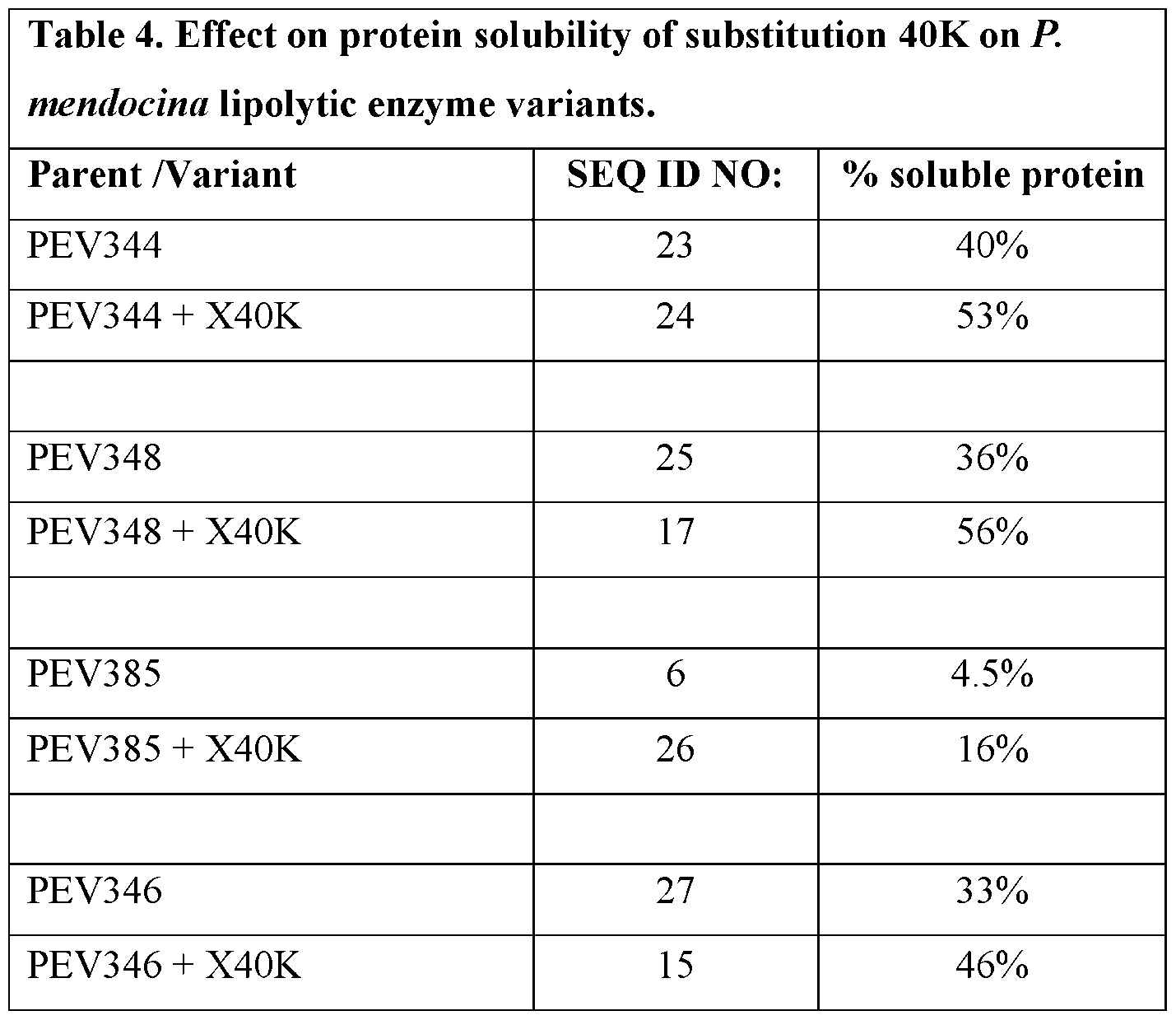 Table 9. Effect on protein solubility of substitutions 40K, 109K and 183K on P. mendocina lipolytic enzyme parent G059Y-F180P-S212D (SEQ ID NO: 43) and ty