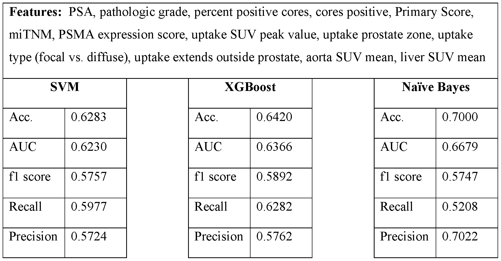 [0370] FIGs.22A and 22B show model performance metrics for (i) a CNN model alone, (ii) a Naïve Bayes classifier based on patient attributes (e.g., clinicopathologic data) alone, and (iii) a fused model, in which CNN model output was combined with clinicopathologic data via a Naïve Bayes classifier. FIG.22C compares CNN model and fused model performance with PRIMARY score-based predictions. As shown in FIGs.22A and 22B, the classifier model using only clinicopathologic data performed only slightly better than the CNN model alone, achieving a median AUC of 0.78 versus a median AUC of 0.72 for the CNN model alone. It appears that a combination of various patient attributes exhibits a slightly higher predictive power in comparison with the spatial, image-based input, features that are the sole input to the CNN model. To further elucidate the significance of induvial input features, CNN model output and six patient attribute features (PSA value, Pathologic Grade, Percent Positive Cores, PRIMARY score, PSMA expression score, and uptake peak value) were analyzed individually to evaluate their individual contribution to model performance. FIG.23 shows results of this analysis, performed via SHAP feature importance for Naïve Bayes, XGBoost, and logistic regression classifiers. In the figure, all features are sorted in descending order, from left to right, according to their contribution to model performance. As shown in FIG.23, viewing each feature individually, the spatial feature analysis output from the CNN model are the most valuable. In particular, CNN model output provided the highest value, displaying a median AUC of 0.72, followed by the model based on PSA value alone at 0.71. [0371] Performance of a Naïve Bayes patient attribute model (without CNN model input) and three fused models are shown in Table 8C, below. Table 8C. Fused model performance. Presented metrics are the median of 50 experiments run with a stratified sampling of train, validation, and test set. CNN input to the fused mode is a 0-1 continuous output of SquezeNetv2, with PET + hotspots model input and group convolution of 2. - 105 - 12297548v2