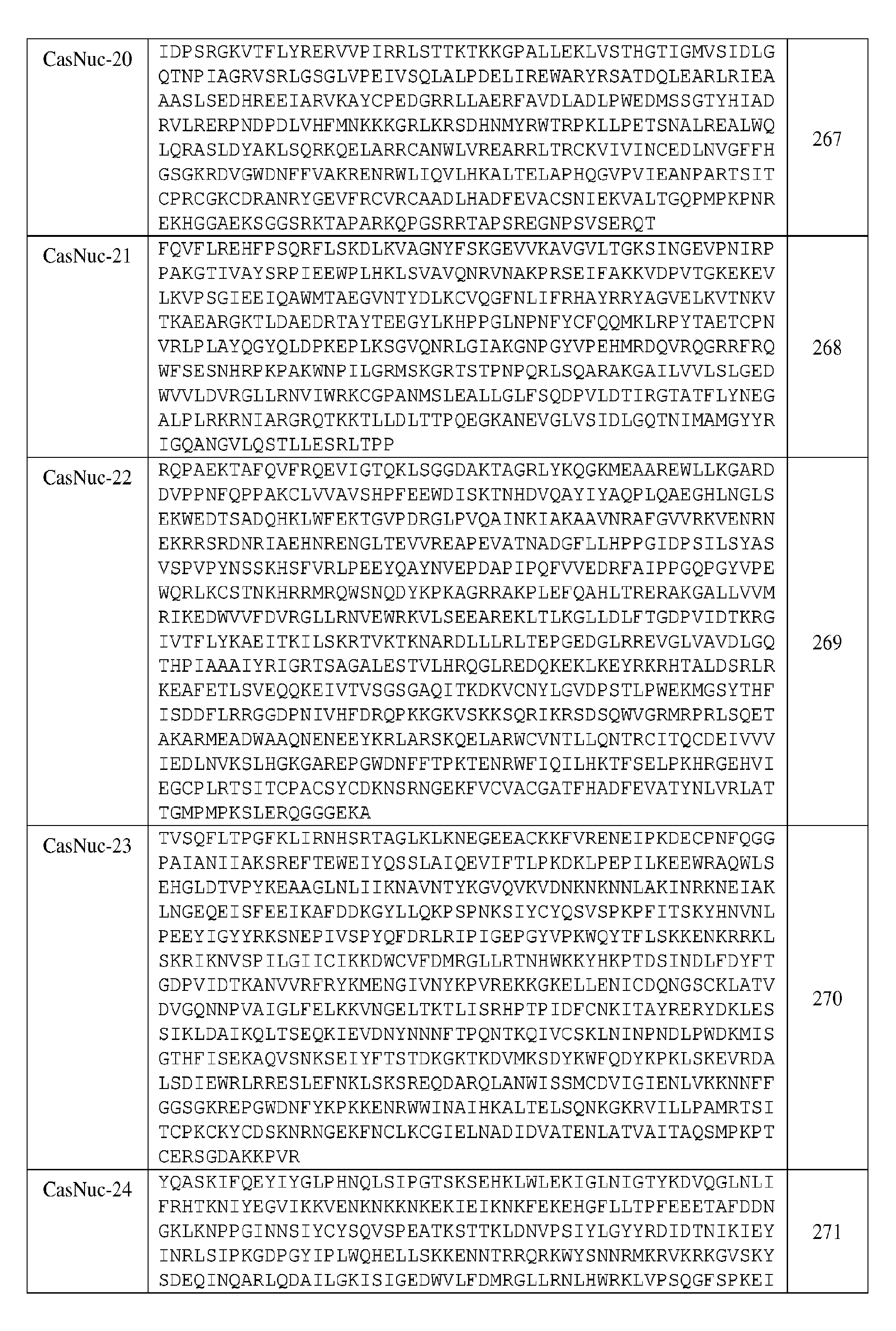[00669] FIG. 1 shows an electropherogram from an analysis of data from Tapestation (High sensitivity D1000). The x-axis of the plot represents the size of the DNA fragments in base pairs (bp), ranging from around 0 bp to above 1500 bp. The y-axis represents the sample fluorescence intensity, measured in fluorescence intensity units (normalized FU). The peaks at around 25 bp and 1500 bp represents the lower and upper marker, respectively. The E3 trajectory shows the electropherogram from the negative control, in which no gRNA was included in the reaction. The peak observed at approximately 800 bp corresponds to the intact target dsDNA molecule, which theoretically measures 828 bp. The absence of additional peaks shows that there was no doublestranded cutting of the dsDNA target molecule. The A3 curve displays the electropherogram of the reaction containing all components: gRNA, purified CasNuc-2, and target dsDNA. The concentration of the target dsDNA peak at 800 bp is decreased, while two new peaks emerge at approximately 250 bp and 550 bp, indicating a double-stranded break in the target DNA at the position targeted by the gRNA.
