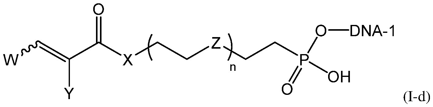 - the at least one attachment moiety can be or can comprise a moiety of Formula (I-b) wherein R R A can be independently a reactive moiety capable of reacting with the at least one 5’- phosphate group of the RNA or the at least one 5 ’-phosphate group of the RNA modified with a leaving group; L can be a bond or a linker moiety; W can be independently H or Ci-6 alkyl; Y is H or Ci-6 alkyl; and X can be NH, N(CI-6 alkyl), or O.