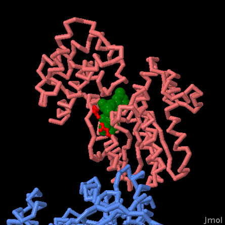 This structure includes the alpha subunit of a G-protein (pink) bound to its signaling target, adenylyl cyclase (blue). The bound nucleotide is in green. The two amino acids in bright red, which form part of the nucleotide-binding site, are mutated in some forms of cancer.