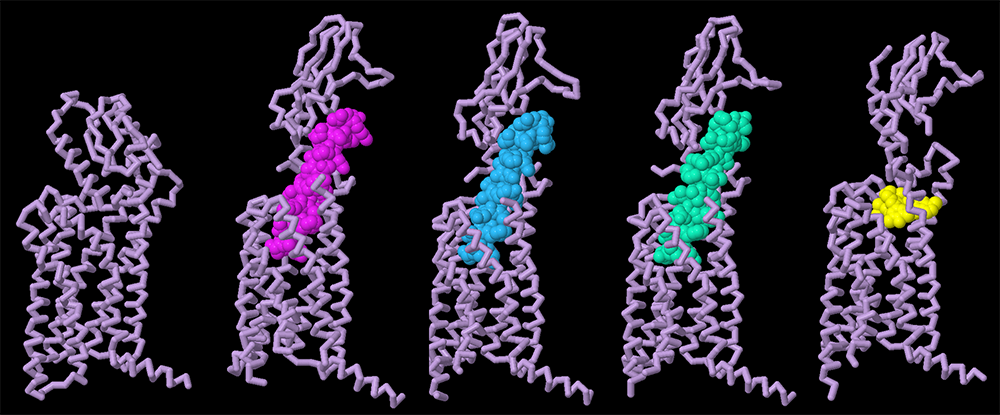 While peptide-based GLP-1 receptor agonists all bind to the GLP-1 receptor in similar ways, the small molecule orforglipron is much smaller with far fewer interactions. Click on the JSmol tab to take a closer look at how GLP-1 (PDB 6X18), semaglutide (PDB 7KI0), tirzepatide (PDB 7FIM), and orforglipron (PDB 6XOX) are able to stabilize the active form of the GLP-1 receptor, and compare these structures to that of the inactive GLP-1 receptor (PDB 6LN2).
