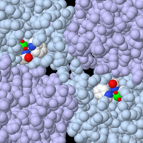 About 15 selenoproteins have been found in human cells. These include several deiodinase enzymes that are essential for the generation of thyroid hormones, several glutathione peroxidases that are important for the conversion and detoxification of compounds with reactive oxygen atoms, and several proteins of unknown function. The active site of glutathione peroxidase is shown here from PDB entry 1gp1 . The picture shows two of the four identical active sites in the tetrameric enzyme. Each active site is composed of a selenocysteine amino acid (the selenium atoms are colored green) which is activated by a tryptophan and a glutamine (shown with atomic colors). In this crystal structure, the selenocysteine is highly oxidized, with two oxygen atoms (shown as small red spheres) bound to the selenium. In the normal catalytic cycle of the enzyme, it is thought that the selenium extracts one reactive oxygen from dangerous peroxides, and then uses water and glutathione to neutralize it.