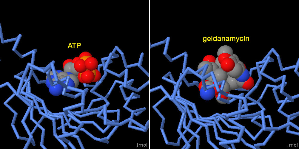 The first compound found to attack Hsp90 is a natural product called geldanamycin made by Streptomyces bacteria, shown here on the right from PDB entry 1yet . It binds in the ATP-binding site on Hsp90, blocking the binding of ATP and thus freezing the large conformational changes needed for function. The structure of ATP bound in this site is shown on the left from PDB entry 1am1 (when you look at this structure yourself, note that only two of the three phosphates are included in the atomic coordinates; the third one is disordered). Unfortunately, geldanamycin is too toxic for use as an anticancer drug, but many better compounds have been developed since then. To explore this structure in more detail, click on the image to view an interactive JSmol.