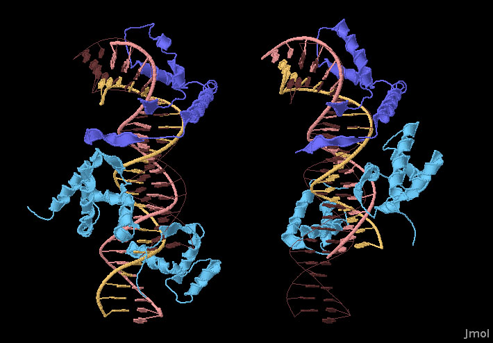 Combinatorial control, where several transcription factors bind together to control a gene, allows the same proteins to be used in different ways. This is shown in two structures of Oct1 and Sox2 bound to different pieces of regulatory DNA. In PDB entry 1gt0 (left), the proteins are bound to the FGF4 enhancer DNA and the two proteins interact weakly through and extended tail of Sox2. In PDB entry 1o4x (right), the proteins are bound closer together on the Hoxb1regulatory sequence and they form a stronger interaction. In this way, the different spacing of the binding sites in the DNA can control the binding strength of the Oct and Sox complex. To explore these structures in more detail, click on the image for an interactive JSmol.