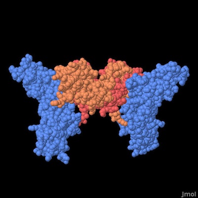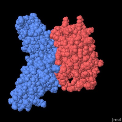 As with many other signaling proteins, interferons bring together two copies of a receptor to initiate the signal inside the cells. Interferon-gamma is a dimeric protein, and two copies of its receptor bind on either side, as seen in PDB entry 1fg9 . Interferon-alpha, on the other hand, is monomeric, and two different receptor chains bind to different portions of the protein. PDB entry 2kz1 shows the interaction with one of the receptor chains. Click on the images above for interactive Jmols of these complexes.