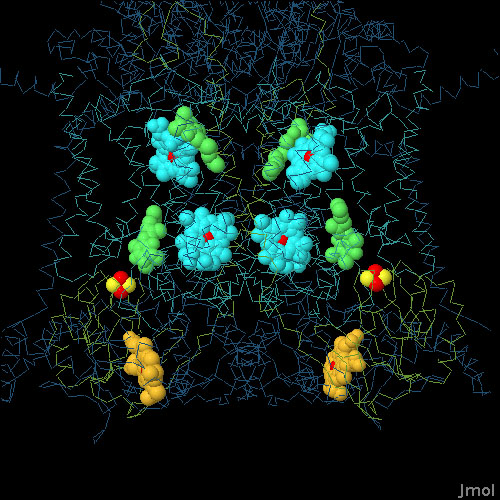 The structures of cytochrome bc1 revealed the path of electrons and the sites for binding of ubiquinol, and also a surprise. The path that leads to cytochrome c passes through an iron-sulfur cluster and then to a heme, which then passes the electron to cytochrome c. The first structures showed that the protein chain that holds the iron sulfur cluster flips back and forth, first bumping up against the ubiquinol and picking up the electron, then moving down to pass the electron to the heme. To take a look at this motion, click on the image here for an interactive Jmol.