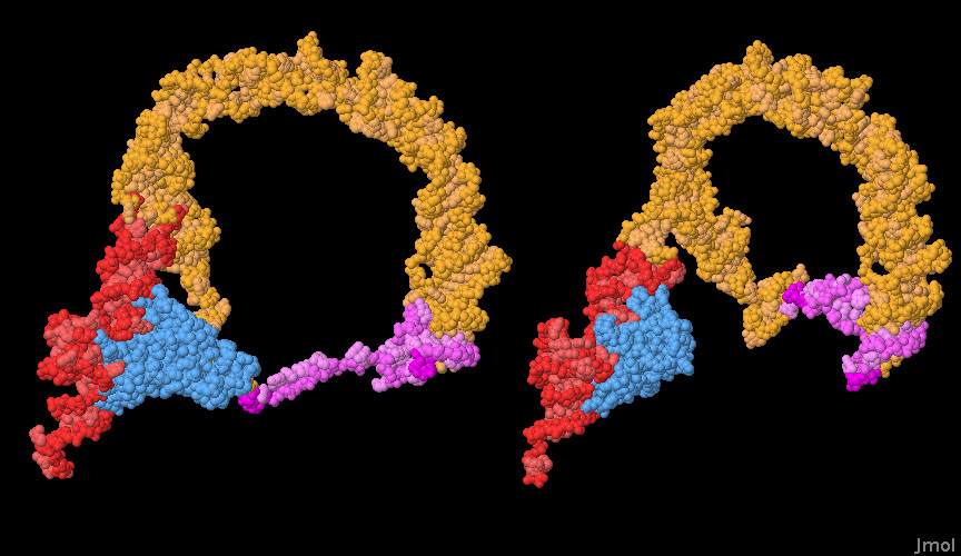 As you can imagine, tmRNA must be very flexible to allow the tRNA portion to enter the ribosomal tRNA site, and the mRNA portion to feed through ribosome and be translated into protein. The two structures shown here (PDB entries 3iyq and 3iyr ) reveal some of this flexibility, showing tmRNA just after it binds to the ribosomal A-site, and after the tRNA-like portion has inserted into the ribosomal P-site. These PDB entries only include atomic coordinates for tmRNA and SmpB--you have to imagine the rest of the ribosome surrounding the structure. To take a closer look at these two structures, click on the image for an interactive Jmol.