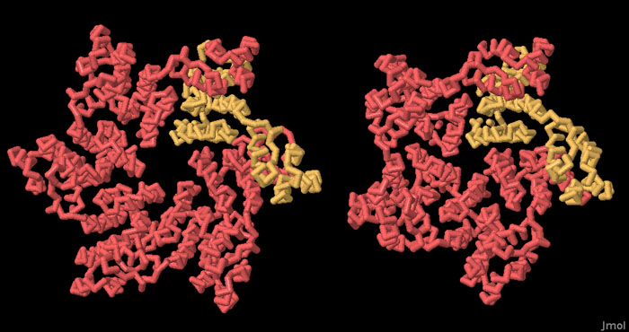 The capsid protein is able to form hexamers and pentamers by shifting slightly in structure. This is an example of the principle of "quasiequivalence", first proposed by Caspar and Klug in 1962. Quasiequivalence is the way that many viruses build capsids that are much larger than is possible with perfect symmetry, but that still only use a single type of protein chain. In the HIV capsid, the interactions between the many subunits are similar, but are deformed slightly to accommodate the different shapes of the cone-shaped portion and the round caps. To take a closer look at these two structures, PDB entries 3mge and 3p05 , click on the image for an interactive Jmol.