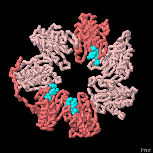 Our cells also build specialized proteasomes for specific tasks. The one shown here, from PDB entry 3unf , is used during immune responses. When a cell is infected with viruses, it chops up the viral proteins and displays them on its surface with MHC, warning the immune system of the problem. A specialized proteasome, termed the immunoproteasome, is induced during the immune response and performs the cleavages. It is similar to the normal proteasome, but has three new catalytic subunits swapped into the core. One of these subunits cleaves the chain next hydrophobic amino acids, creating peptides that anchor particularly well to MHC. The illustration shows one ring of subunits, with an inhibitor (in turquoise) bound to the three catalytic subunits. To explore the immunoproteasome core in more detail, click on the image for an interactive Jmol.