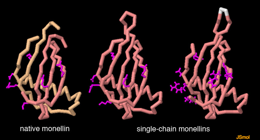 Since it’s so sweet, monellin would be great for creating diet foods, since only a little is needed. However, it rapidly loses its sweetness when heated, so it’s not much good for baking. To solve this problem, researchers have engineered new heat-stable forms of monellin by connecting its two chains. To explore natural monellin (PDB entry 3mon) and two engineered single-chain forms (PDB entries 1mol and 1fa3), click on the image for an interactive JSmol.