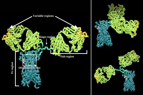 Six loops (yellow) at the tips of the Fab region (green) form the binding sites of antibodies, enabling each arm to selectively attach to a unique target. These loops are termed “hypervariable” loops because they have very different amino acid sequences. Antibodies are very flexible, allowing the two Fab arms to find neighboring sites on a target, such as the surface of a virus. This flexibility makes it difficult to study intact antibodies. Most of the hundreds of antibody structures available at the PDB are fragments of antibodies, typically of just the Fab arm with the specific binding pocket. Three examples of intact antibodies are shown here (PDB entries 1igt, 1igy, and 1hzh). Notice how the Fab arms are joined to the Fc domain (blue) through flexible hinge regions (turquoise). In addition, antibodies are glycoproteins and incorporate carbohydrates (white) to stabilize the structure of the Fc and hinge regions.