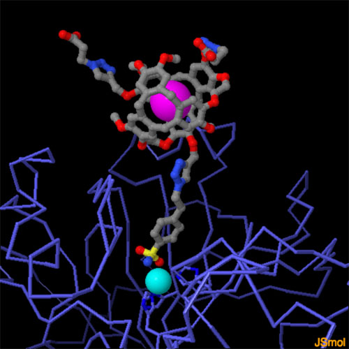 An isotope of xenon (129-Xe) is used as a contrast agent for magnetic resonance imaging (MRI) in medical diagnostic testing, both as a gas to image airspaces in the lung, and dissolved in body fluids to image the bloodstream and tissues. Designed cryptophanes are being developed as a way to target the xenon to specific proteins. Cryptophanes are hollow shells, but with openings on the sides that allow entry and exit of host molecules. The cryptophane shown here is the right size for a single xenon atom (shown in magenta), and is coupled to a specific inhibitor of carbonic anhydrase, which recognizes a zinc atom (turquoise) in the enzyme active site. Upon binding of the designed cryptophane to the target protein, xenon displays a distinctive MRI spectrum. To explore the structure of this cryptophane bound to human carbonic anhydrase II (PDB entry 3cyu), click on the image for an interactive JSmol.