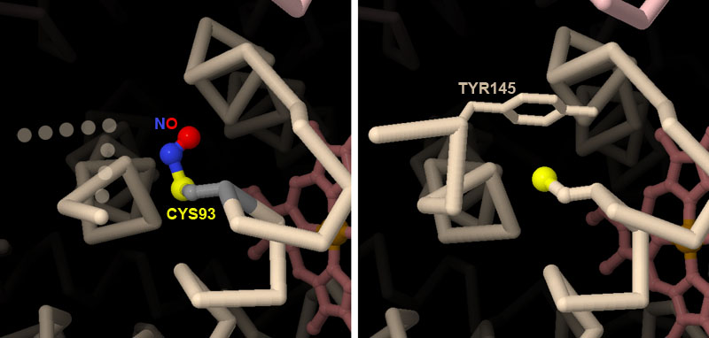 The structure of S-nitrosylated hemoglobin (PDB entry 1buw) was determined by starting with crystals of hemoglobin with carbon monoxide, and then exposing them to nitric oxide gas. Since the carbon-monoxide-bound form has a similar structure as oxygenated hemoglobin, only small changes occurred when nitric oxide attached: two amino acids at the end of the chain (numbers 145 and 146) became disordered. To explore the structures of S-nitrosylated and carbonmonoxy hemoglobin (PDB entry 1hco), click on the image for an interactive JSmol.