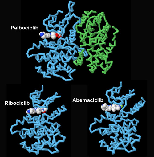 CDK enzymes are targets for cancer chemotherapy, since by blocking them, we can block the abnormal growth of tumor cells. Much effort has been focused on CDK4 and CDK6, which guard a key restriction point before the cell starts DNA replication. Structures of three US FDA-approved drugs are shown here (PDB entries 2euf, 5l2t and 5l2s), all of which were discovered through structure-based design. They all have different chemical structures, but bind in a similar way to the active site of the enzyme, blocking its ability to bind to ATP and phosphorylate target proteins. To compare these structures in more detail, click on the image for an interactive JSmol.