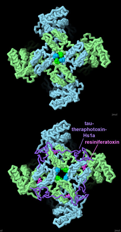 Cryoelectron microscopy has allowed researchers to capture TRP channels in many different states. PDB entry 5irz is the closed TRPV1 channel, with several rings of amino acids forming constrictions that block the ion pore. In 5irx, the channel is held open by the binding of two toxins (shown in purple and magenta), shifting the location of these amino acids to open the ion conducting pathway. To explore these structures in more detail, click on the image for an interactive JSmol.